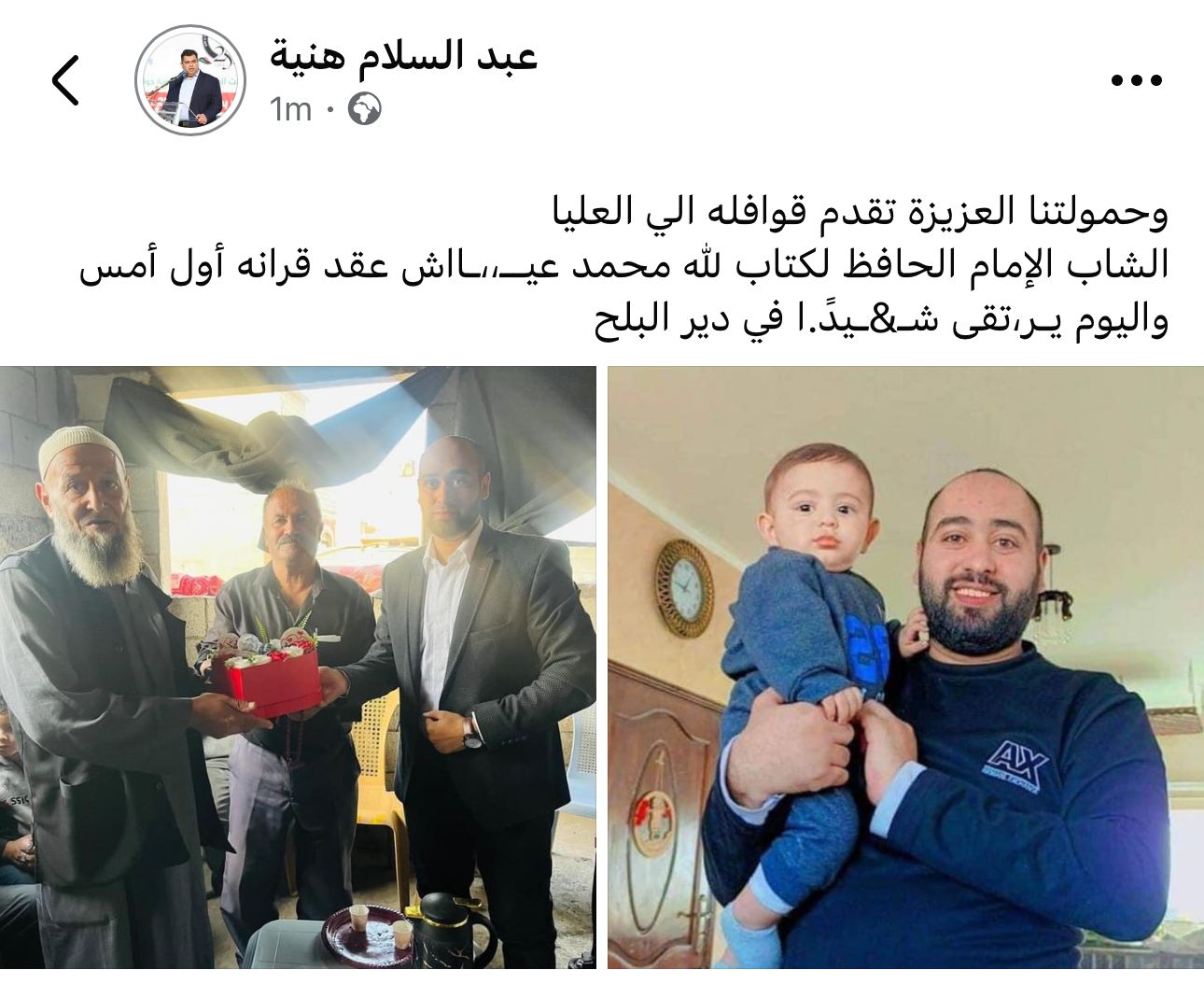نعى عبد السلام هنية، مساعد الأمين العام للمجلس الأعلى للشباب والرياضة الفلسطينية، الشاب الشهيد محمد عياش، الذي عقد قرانه أول أمس، قبل أن يرتقي شهيدًا في دير البلح اليوم، إثر عدوان إسرائيلي غاشم.