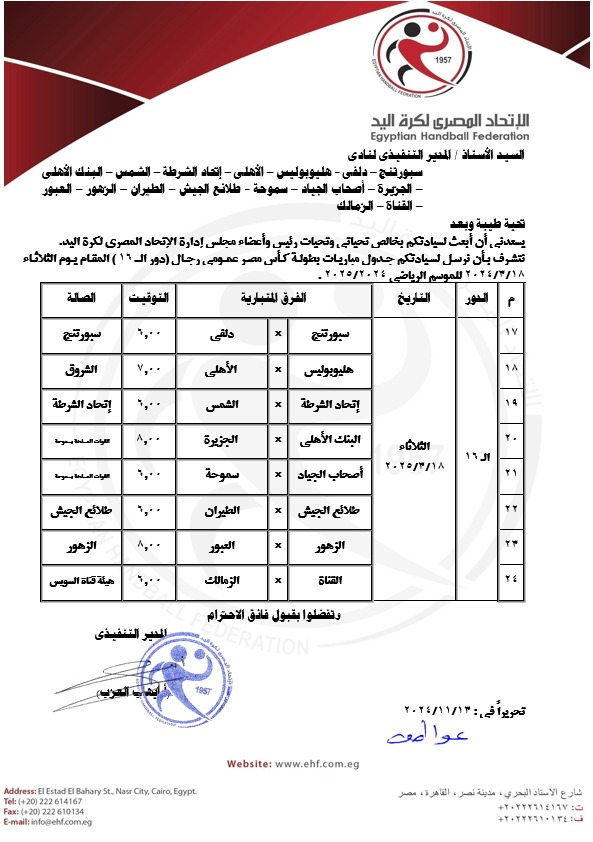 موعد مباريات دور الـ 16 بكأس مصر لكرة اليد