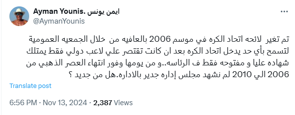 وقال أيمن يونس - في تصريحات عبر حسابه الرسمي على منصة X -: تم تغيير لائحة اتحاد الكرة في موسم 2006 بالعافية من خلال الجمعية العمومية لتسمح بأي حد يدخل اتحاد الكرة بعد أن كانت تقتصر على لاعب دولي فقط يمتلك شهادة عليا ومفتوحة فقط في الرئاسة.