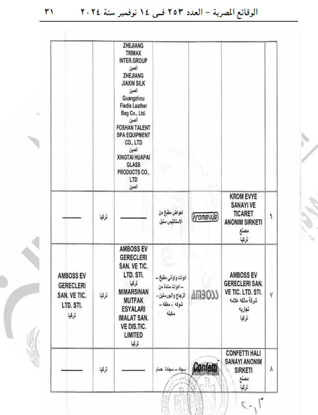 نشرت الجريدة الرسمية، قراري الهيئة العامة للرقابة على الصادرات والواردات رقم 1458 ورقم 1459 لسنة 2024، بشأن قيد بعض المصانع والشركات مالكة العلامات التجارية المستوفاة لقواعد تسجيل المصانع المؤهلة لتصدير منتجاتها إلى مصر.