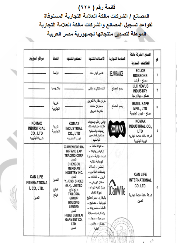 وفيما يلي القائمة رقم 628 ورقم 116 التي تتضمن المصانع والشركات مالكة العلامة التجارية المستوفاة القواعد تسجيل المصانع والشركات مالكة العلامة التجارية المؤهلة لتصدير منتجاتها إلى مصر: