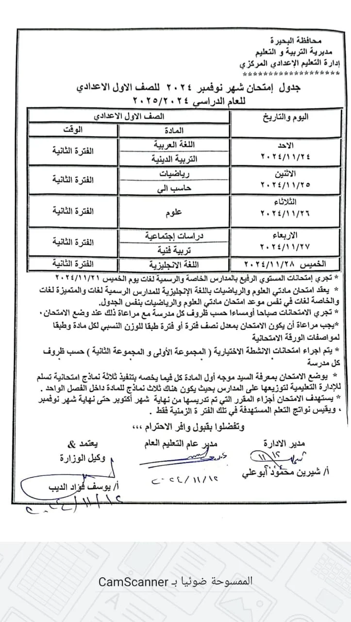 من المقرر أن تعقد امتحانات شهر نوفمبر في الأسبوع الأخير من الشهر وفق جدول موحد تحدده المديرية، مع مراعاة كافة الإجازات الرسمية، كما يتم تقييم طلاب الصفين الأول والثاني الابتدائي من خلال معلم المادة خلال الحصة الدراسية.