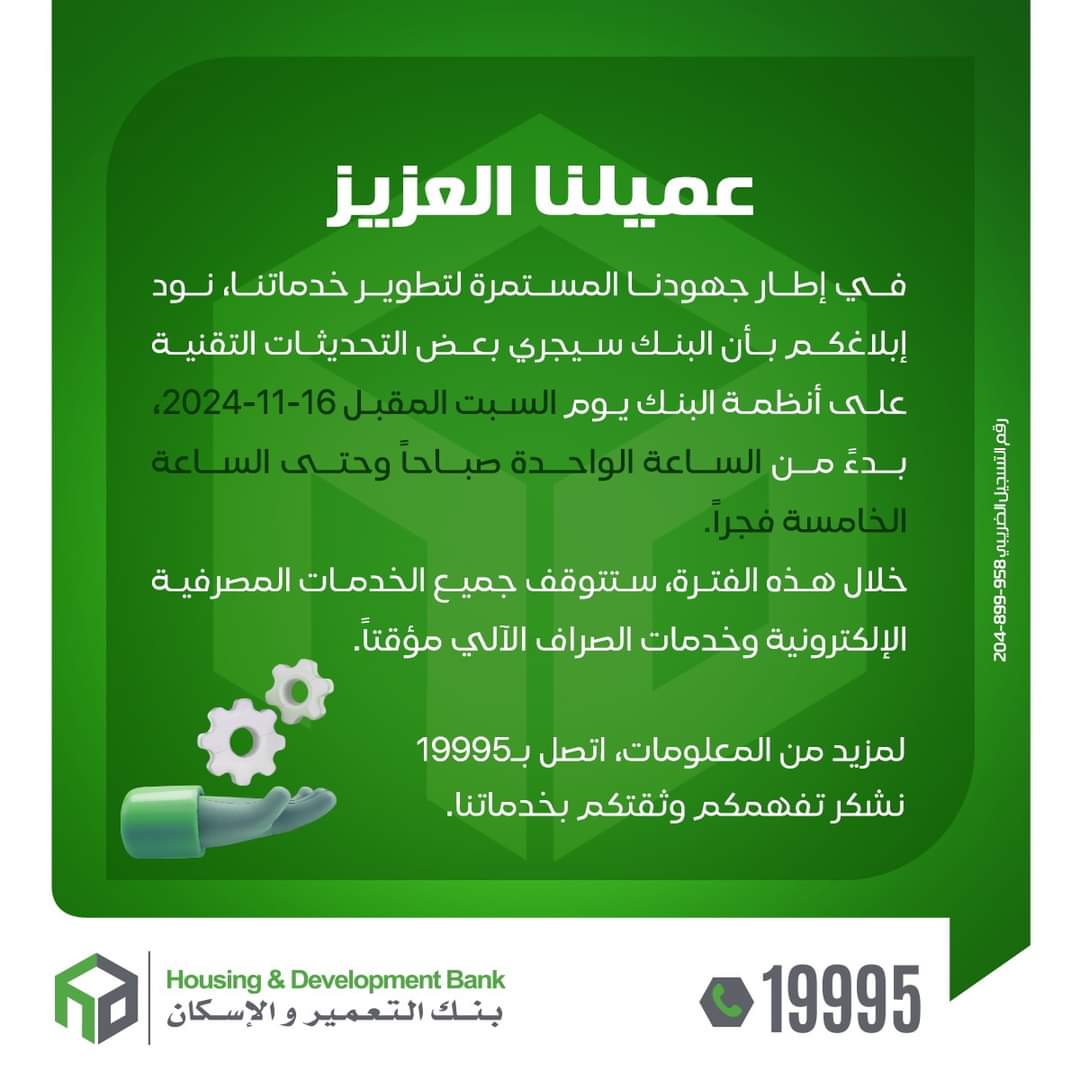 وقال البنك في رسالة موجهة إلى العملاء: عميلنا العزيز، في إطار جهودنا المستمرة لتطوير خدماتنا، نود إبلاغكم بأن البنك ( التعمير والإسكان ) سيجري بعض التحديثات التقنية على أنظمة البنك يوم السبت المقبل 16 - 11 -2024، بدء من الساعة الواحدة صباحا وحتى الساعة الخامسة فجرا.