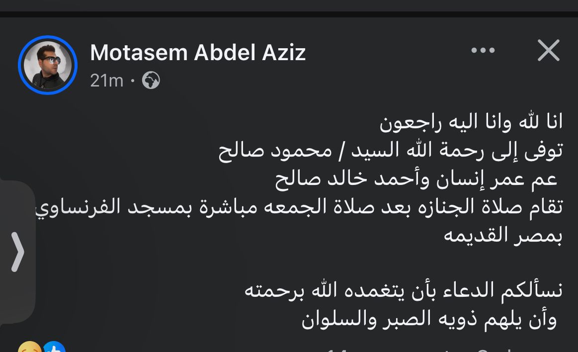 وكتب معتصم عبد العزيز نجل الفنان الراحل طارق عبر العزيز، منشورًا عبر حسابه الشخصي على الفيس بوك، يكشف فيه موعد جنازة شقيق الفنان خالد صالح، قائلا: إنا لله وإنا إليه راجعون، توفي إلى رحمة الله تعالى، السيد محمود صالح، عم عمر إنسان وأحمد خالد صالح، وتقام الجنازة بعد صلاة الجمعة مباشرة من مسجد الفرنساوي بمصر القديمة، نسألكم الدعاء بأن يتغمده الله برحمته وأن يلهم ذويه الصبر