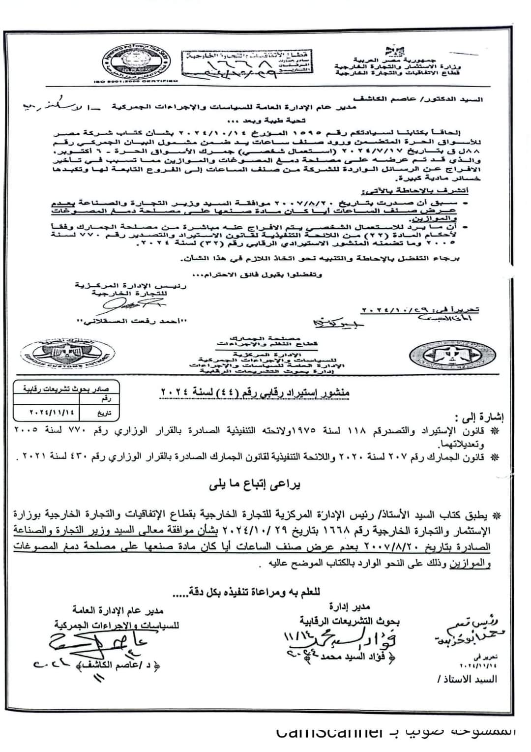 أصدرت مصلحة الجمارك، قرارًا جديدًا بشأن عدم عرض صنف الساعات أيا كان مادة صنعها على مصلحة دمغ المصوغات والموازين.