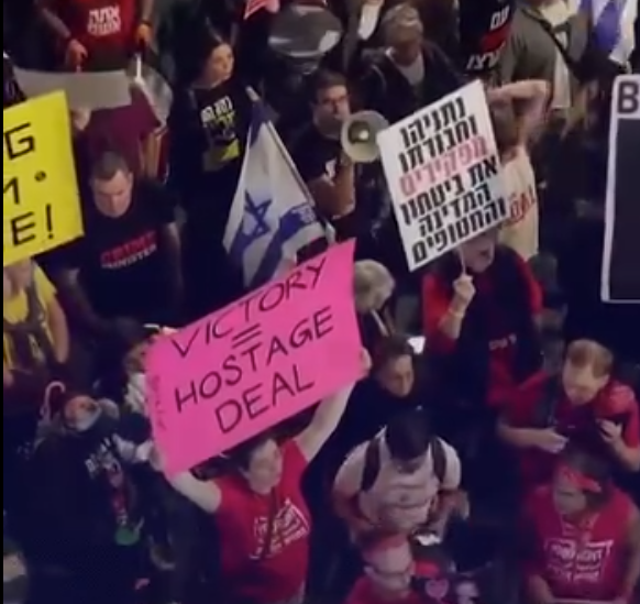 شهدت تل أبيب ليلًا، تظاهرات حاشدة شارك فيها آلاف الإسرائيليين، حيث طالب المتظاهرون الحكومة الإسرائيلية بإبرام صفقة للإفراج عن المحتجزين في قطاع غزة.