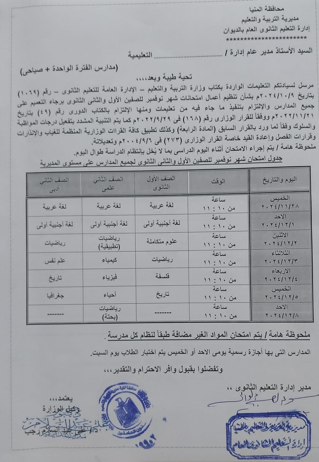 جدول امتحانات شهر نوفمبر لطلاب محافظة المنيا