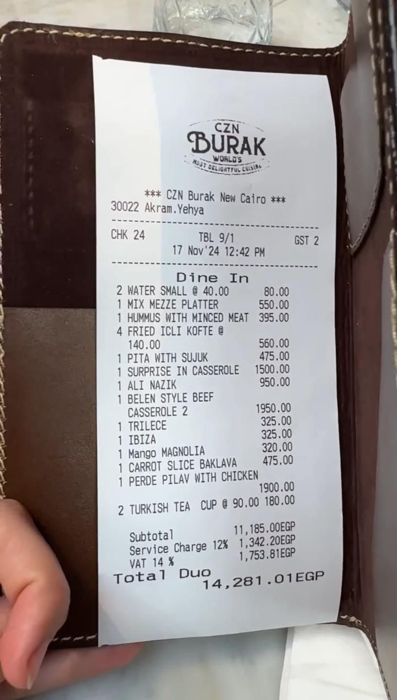 15 ألف جنيه وخدمة سيئة| فاتورة لمطعم الشيف بوراك تثير الجدل.. ما القصة؟