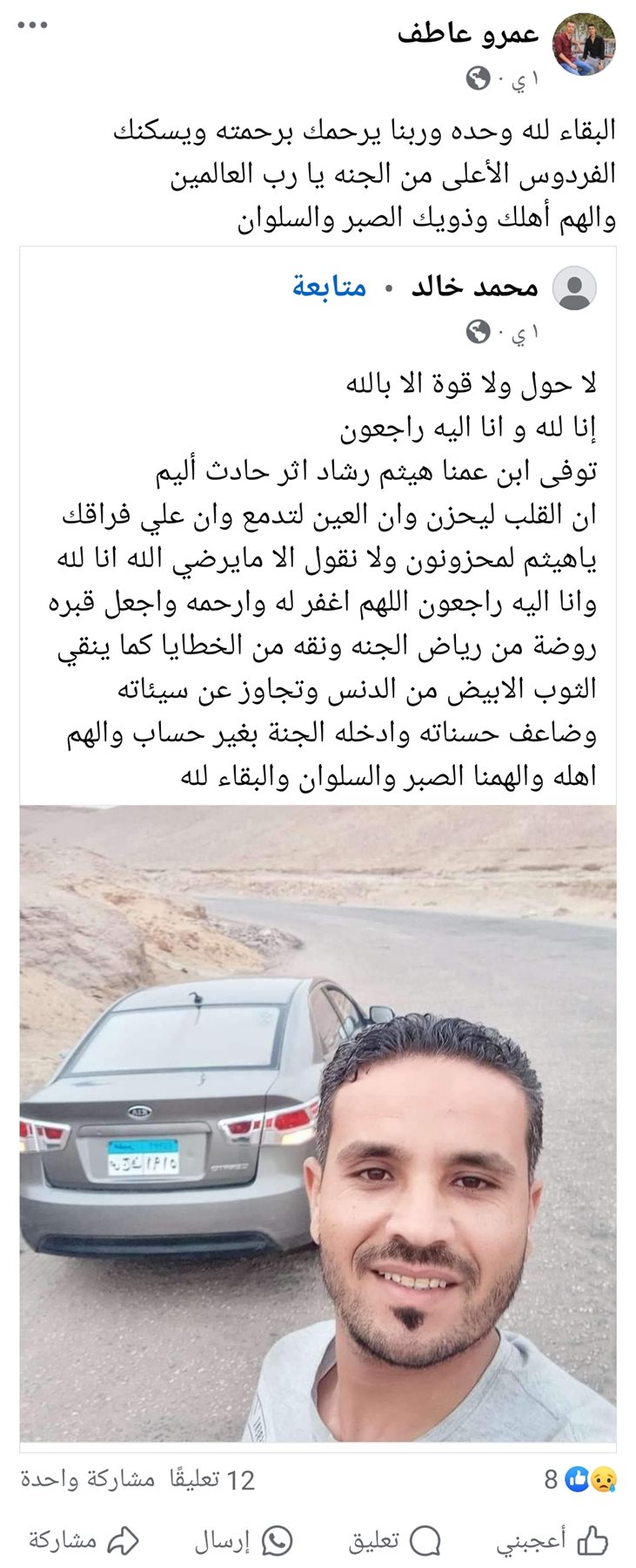 وأضاف: الشاب الفقيد نشر بالأمس منشورًا عبر حسابه الشخصي على فيسبوك، نعى فيه صديقه هيثم رشاد، والذي رحل أيضا في ذات اليوم متأثرا بإصابته في حادث تصادم سيارة ملاكي بأخرى نقل بمحافظة سوهاج، وسبقه بمنشور آخر دعاء لنفسه جاء فيه: اللهم إني أستغفرك من جميع ذنوبي.. صغيرِها وكبيرِها، أستغفِرُك عدد ما طاوعتني نفسي على الذنب، وأستغفِرُك عدد أيام حياتي.. قبل المَوت وبعده، وأستغفِرُك حتى يملّ القمر، وحتى تطلع الشمس من مَغربها، أستغفرك عدد ما استغفرَك المُستغفرون، وعدد ما سبَّح المُسبِّحون، وعدد كل صغيرٍ وكبيرٍ في الكَون، أستغفِرُك حتّي تغفر لي وتُدخلني الجَنَّة."