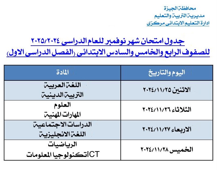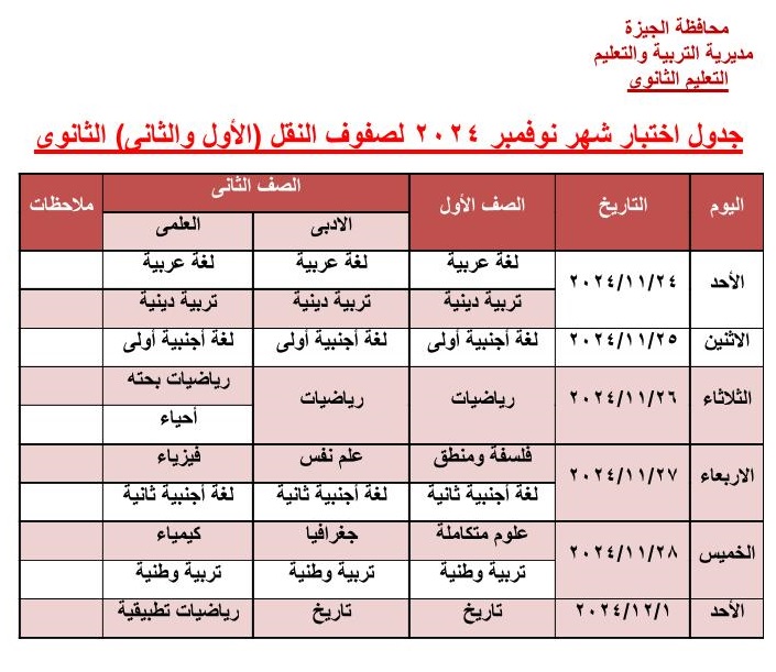 جداول امتحانات شهر نوفمبر 2024 لطلاب النقل بالجيزة