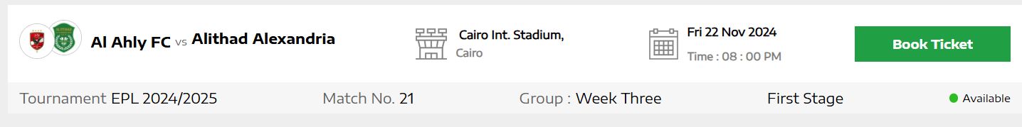 أتاحت شركة تذكرتي رابط حجز تذاكر مباراة الأهلي القادمة في الدوري المصري موسم 2024-2025، والتي تقام بالجولة الثالثة، والذي يستطيع الجماهير حجز تذكرة المواجهة، والدخول عبر البطاقة الخاصة بحضور المباريات FAN ID، إذ يقوم الفرد بتسجيل حساب عبر الموقع الرسمي، واختيار الفريق المفضل، الذي يكون مخصص له حضور جميع مبارياته في دوري نايل 2024-2025، ومن ثم حجز تذكرة المباريات سواء في البطولات المحلية أو الإفريقية.