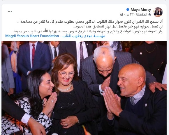 وقالت وزيرة التضامن الاجتماعي، في منشور بها عبر صفحتها الشخصية بموقع التواصل الاجتماعي، إن معرفة الدكتور مجدي يعقوب درس للتواضع والكرم والمهنية، وإذا سمح لك القدر أن تكون بجواره فقدم كل ما تقدر من مساعدة، مردفة: أن يسمح لك القدر ان تكون بجوار ملك القلوب الدكتور مجدي يعقوب فقدم كل ما تقدر من مساعدة.. أن تعمل بجواره فهو خير فاعمل ليل نهار لتستحق هذه الجيرة.. وأن تعرفه فهو درس للتواضع والكرم والمهنية وقيادة فريق تدرس ومحبة يزرعها الله في قلوب من يعرفه.