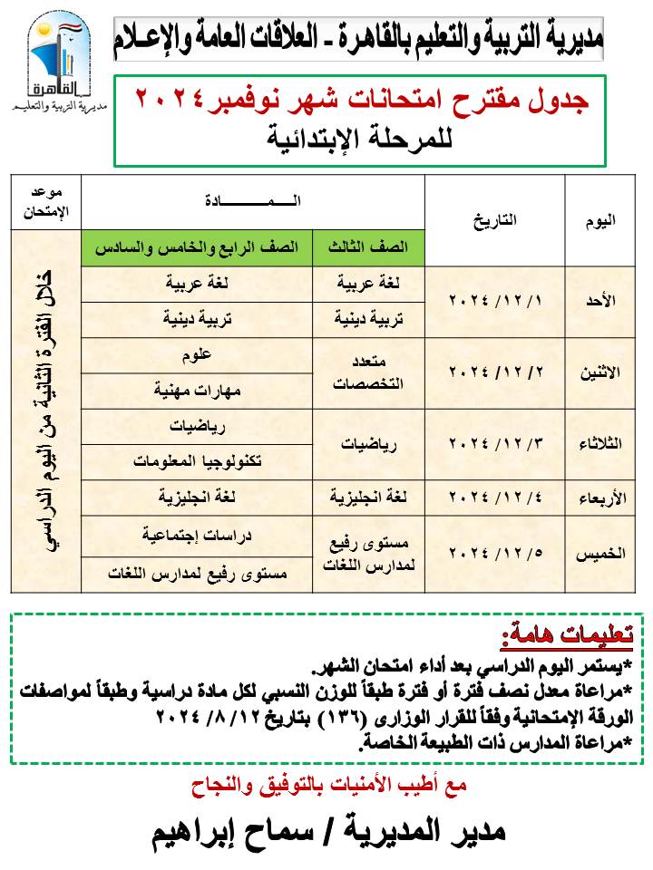 جدول امتحانات شهر نوفمبر 2024 لطلاب المرحلة الابتدائية بالقاهرة