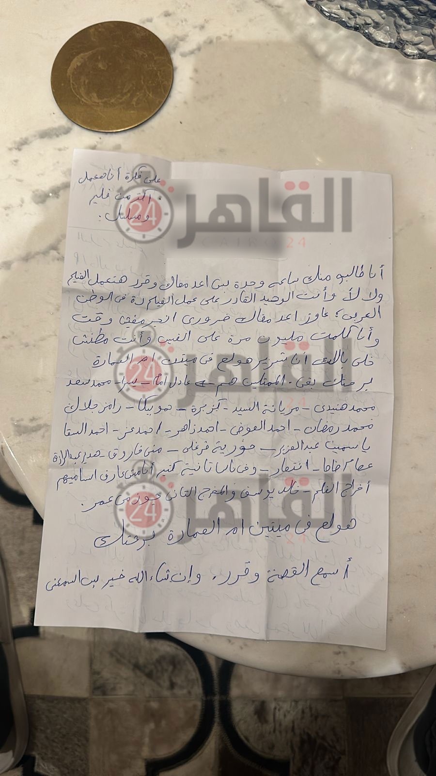ووفقًا للرسالة فقد تعهد هذا الشخص بتدمير مكتب المخرج خالد يوسف أو إشعال النيران في العمارة إذا لم يتم تنفيذ طلبه خلال 3 أيام، حيث حدد المعتدي أسماء النجوم الذين يجب أن يشاركوا في الفيلم، منهم عادل إمام، يسرا، أحمد السقا، أحمد عز، محمد سعد، وحورية فرغلي.