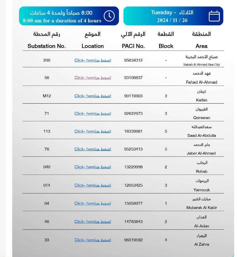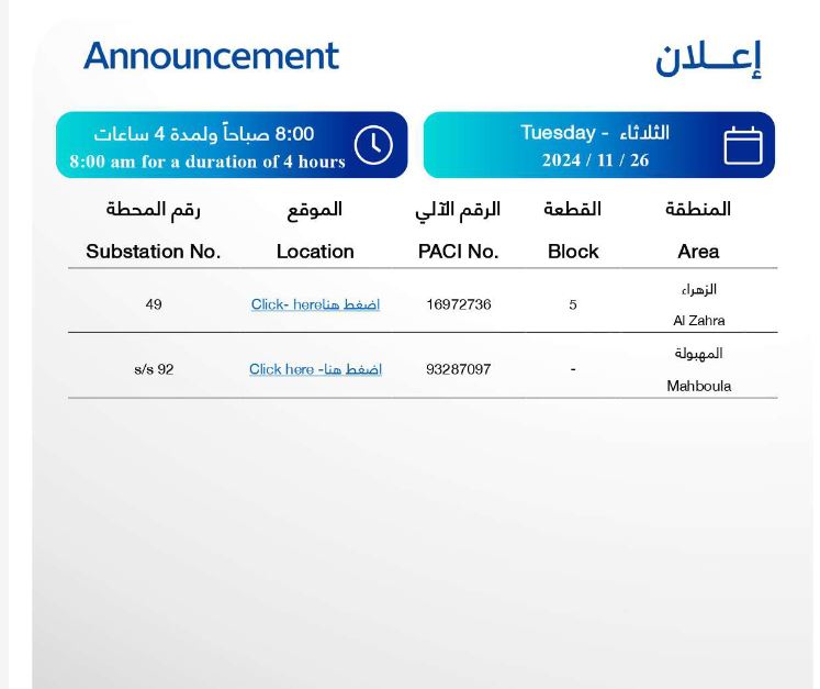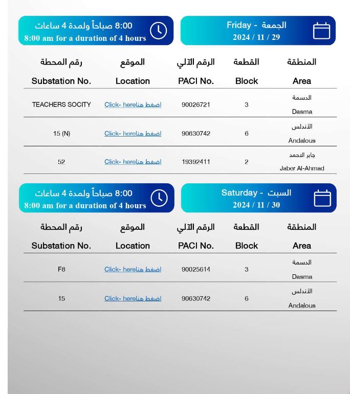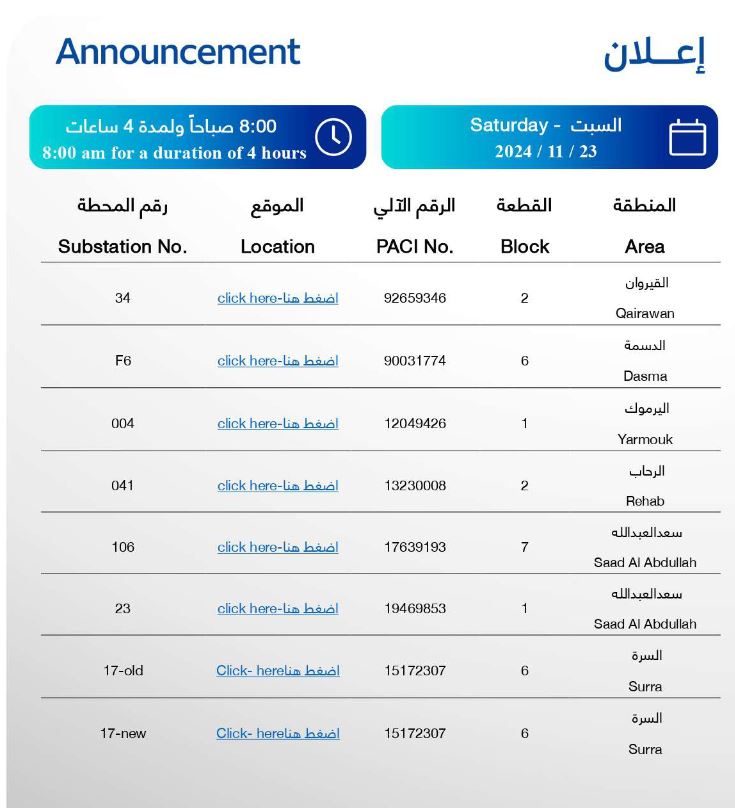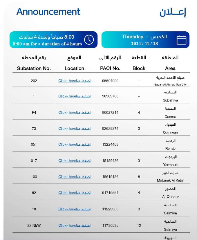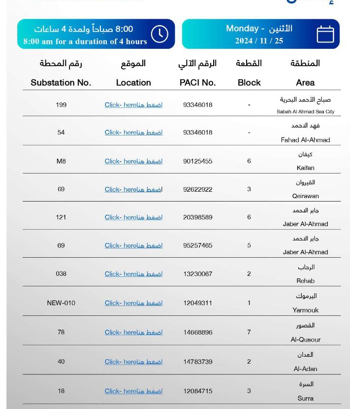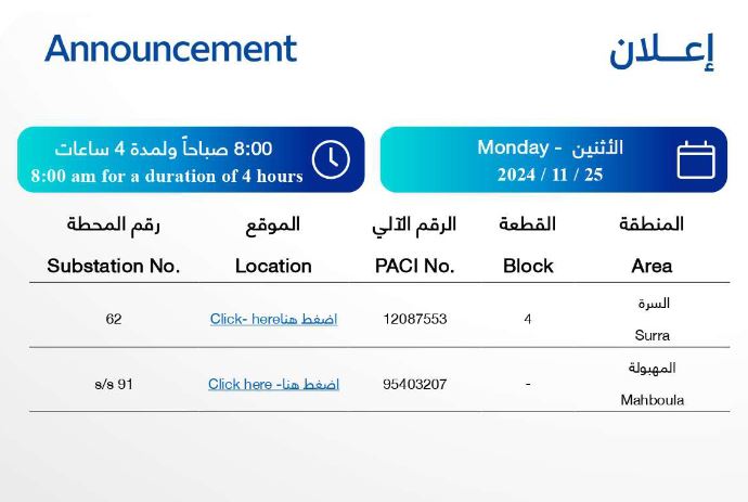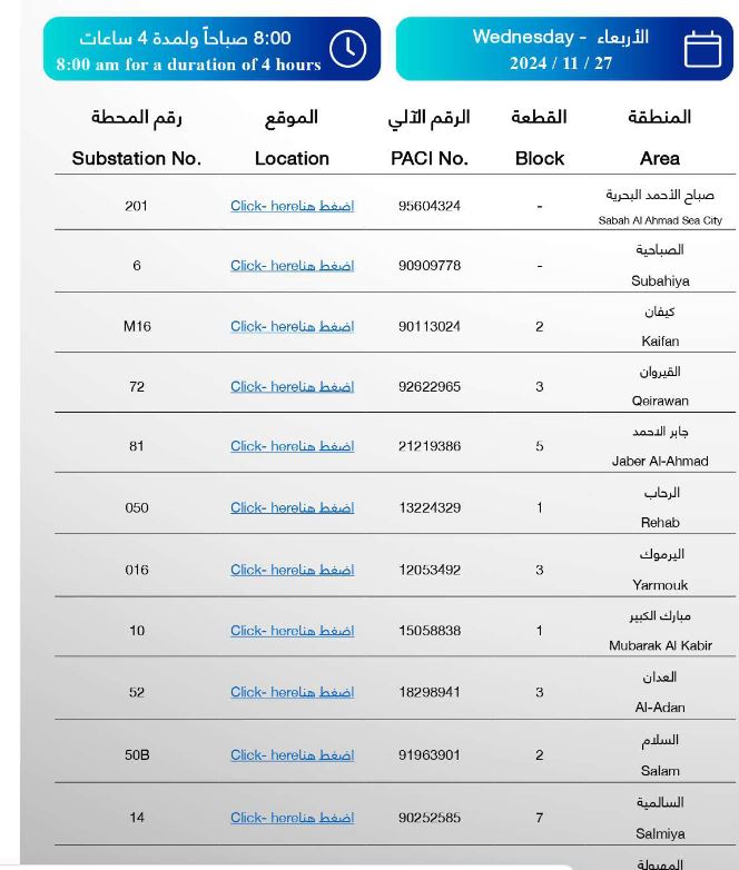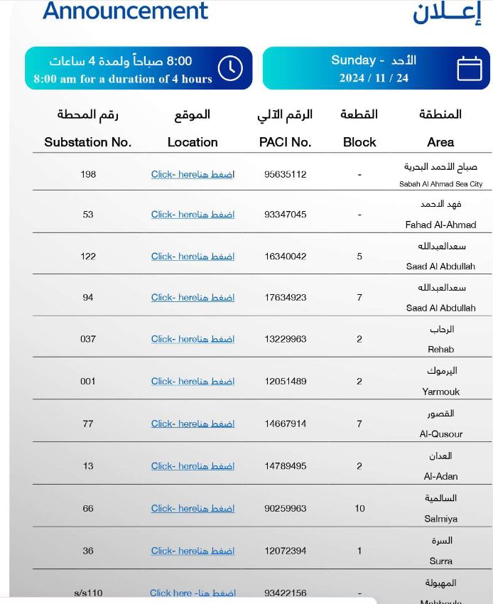 تشهد الكويت اليوم السبت، انقطاع مجدول للتيار الكهربائي عن بعض الأماكن وفقا للجدول المحدد من قبل وزارة الكهرباء والماء والطاقة، وذلك مع بدء أعمال الصيانة في بعض محطات التحويل الثانوية.