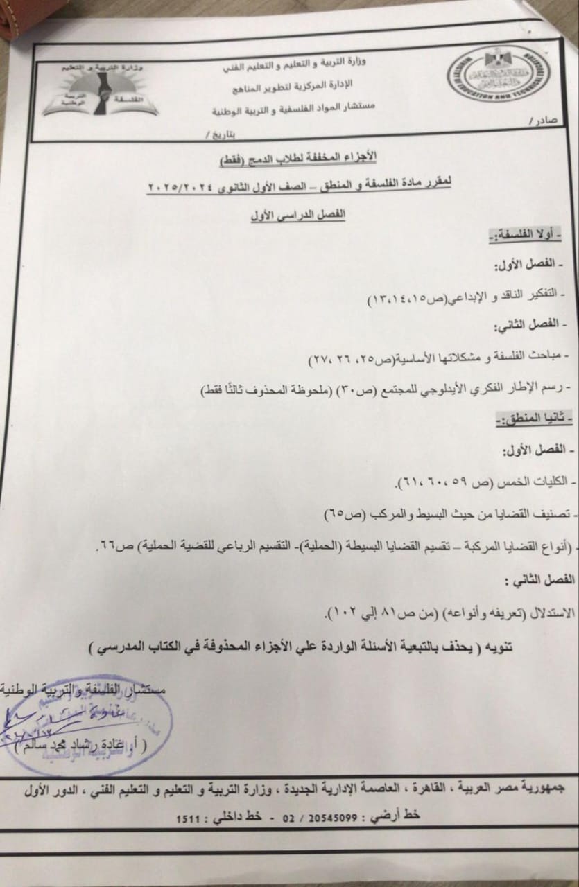أعلنت وزارة التربية والتعليم والتعليم الفني، الأجزاء المخففة لطلاب الصف الأول الثانوي العام دمج لمقرر مادة الفلسفة والمنطق للفصل الدراسي الأول، كالتالي: