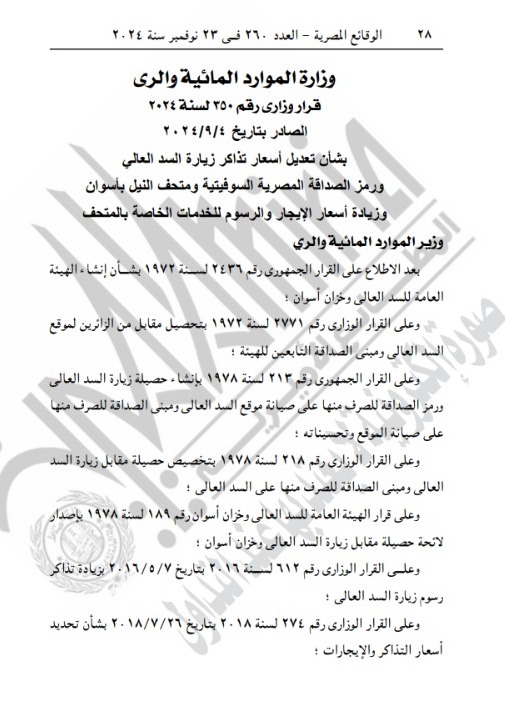 نشرت الجريدة الرسمية في عددها الصادر، منذ قليل، قرار وزارة الموارد المائية والري بشأن تعديل أسعار تذاكر زيارة السد العالي ورمز الصداقة المصرية السوفيتية ومتحف النيل بأسوان وزيادة أسعار الإيجار والرسوم للخدمات الخاصة بالمتحف.