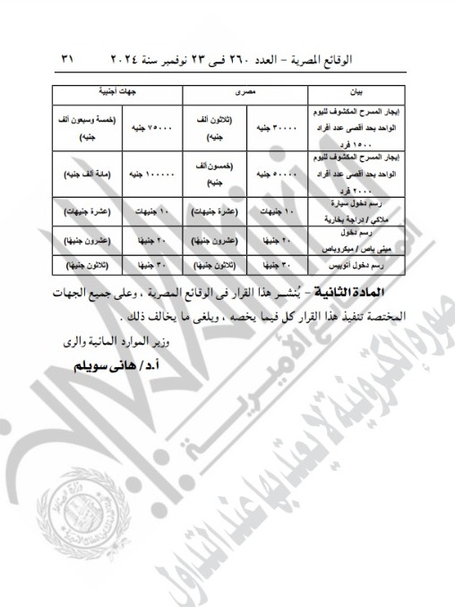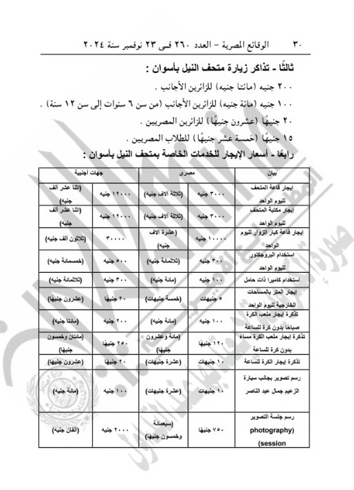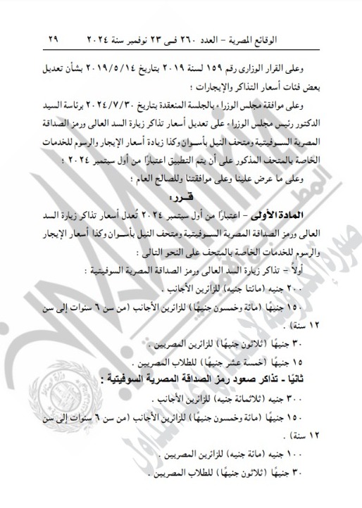 وقالت الجريدة الرسمية، إن المادة الأولى قررت تعديل أسعار تذاكر زيارة السد العالي ورمز الصداقة المصرية السوفيتية ومتحف النيل بأسوان، وكذا أسعار الإيجار والرسوم للخدمات الخاصة بالمتحف اعتبارًا من أول سبتمبر 2024، على النحو التالي: