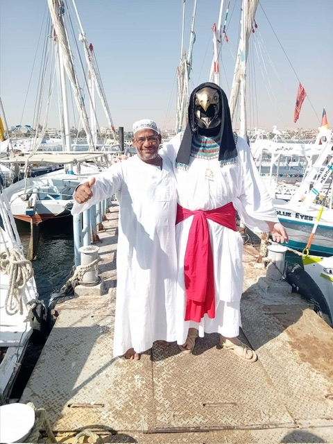 مرتديا زي حورس.. سائح ألماني يثير إعجاب أهالي الأقصر