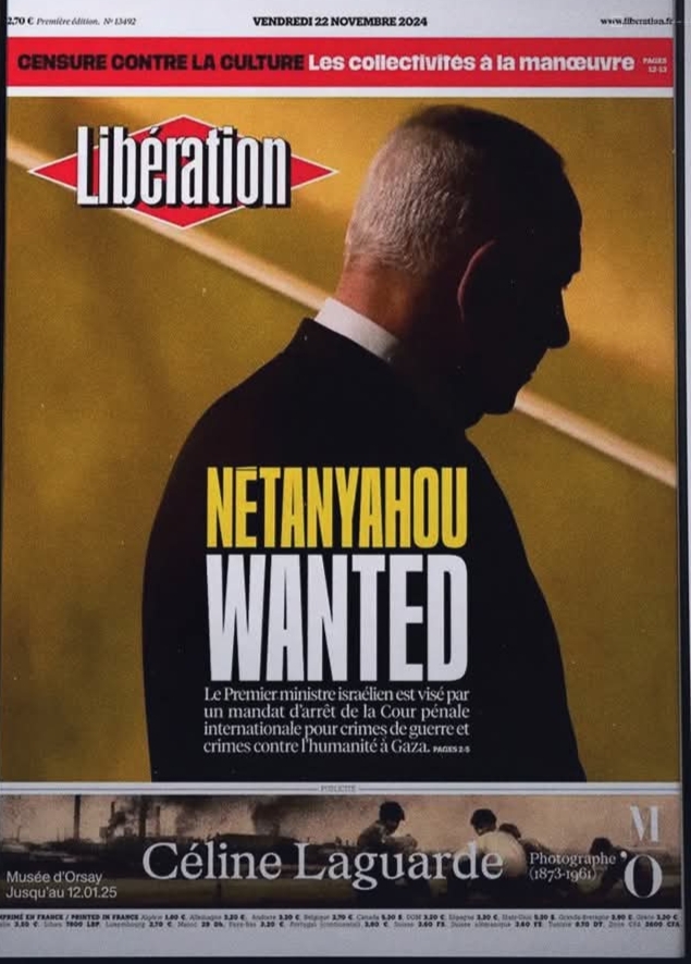 نشرت صحيفة ليبراسيون الفرنسية على صفحة غلافها صورة ملتقطة من الخلف لرئيس الوزراء الإسرائيلي بنيامين نتنياهو بدا فيها جنبات وجهه مظللة بالسواد مع عنوان ممهور بالخط العريض نتنياهو مطلوب، وهي العبارة الشهيرة المستخدمة في لافتات المجرمين الفارين من العدالة.