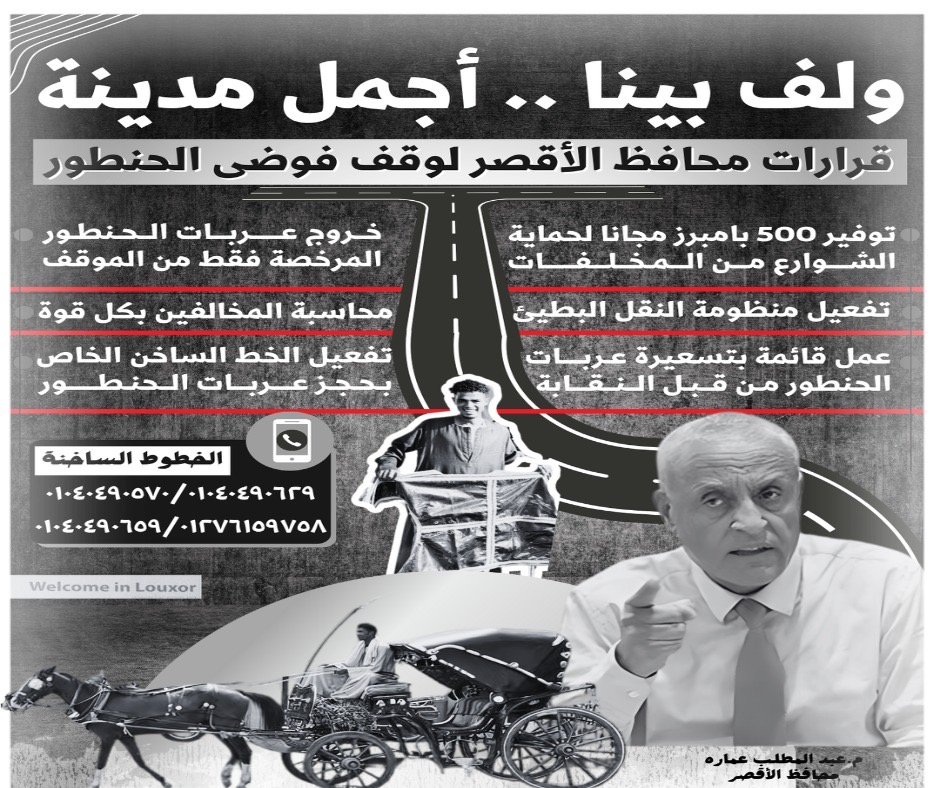 وأصدر المهندس عبدالمطلب عمارة محافظ الأقصر، عدة قرارات لتنظيم حركة سير الحنطور، بهدف الحفاظ على المظهر الحضاري لعاصمة السياحة العالمية، أبرزها تفعيل الخط الساخن بحجز عربات الحنطور، وخروج عربات الحنطور المرخصة فقط من المواقف المخصصة لها بالمدينة.