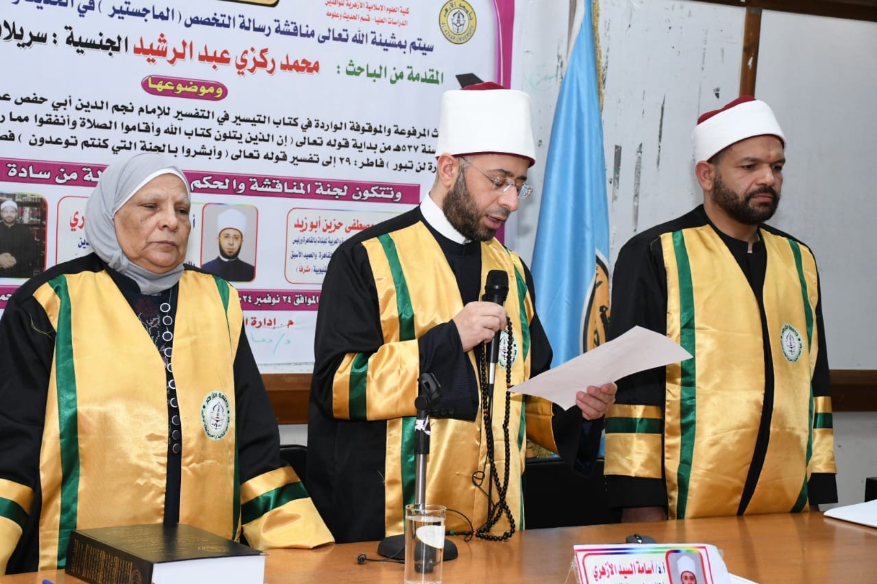 شارك الدكتور أسامة الأزهري، وزير الأوقاف، في مناقشة رسالة التخصص (الماجستير) المقدمة من الباحث محمد ركزي عبد الرشيد، من جمهورية سريلانكا، بعنوان الأحاديث المرفوعة والموقوفة الواردة في كتاب التيسير في التفسير للإمام نجم الدين أبي حفص عمر بن محمد النسفي الحنفي المتوفى سنة 537 هـ من بداية قوله تعالى: "إِنَّ الَّذِينَ يَتْلُونَ كِتَابَ اللَّهِ وَأَقَامُوا الصَّلَاةَ وَأَنفَقُوا مِمَّا رَزَقْنَاهُمْ سِرًّا وَعَلَانِيَةً يَرْجُونَ تِجَارَةً لَّن تَبُورَ" (فاطر: 29)، إلى تفسير قوله تعالى: "وَأَبْشِرُوا بِالْجَنَّةِ الَّتِي كُنتُمْ تُوعَدُونَ" (فصلت: 30) تخريجًا ودراسة، في قسم الحديث وعلومه بكلية العلوم الإسلامية للوافدين بجامعة الأزهر بالقاهرة.