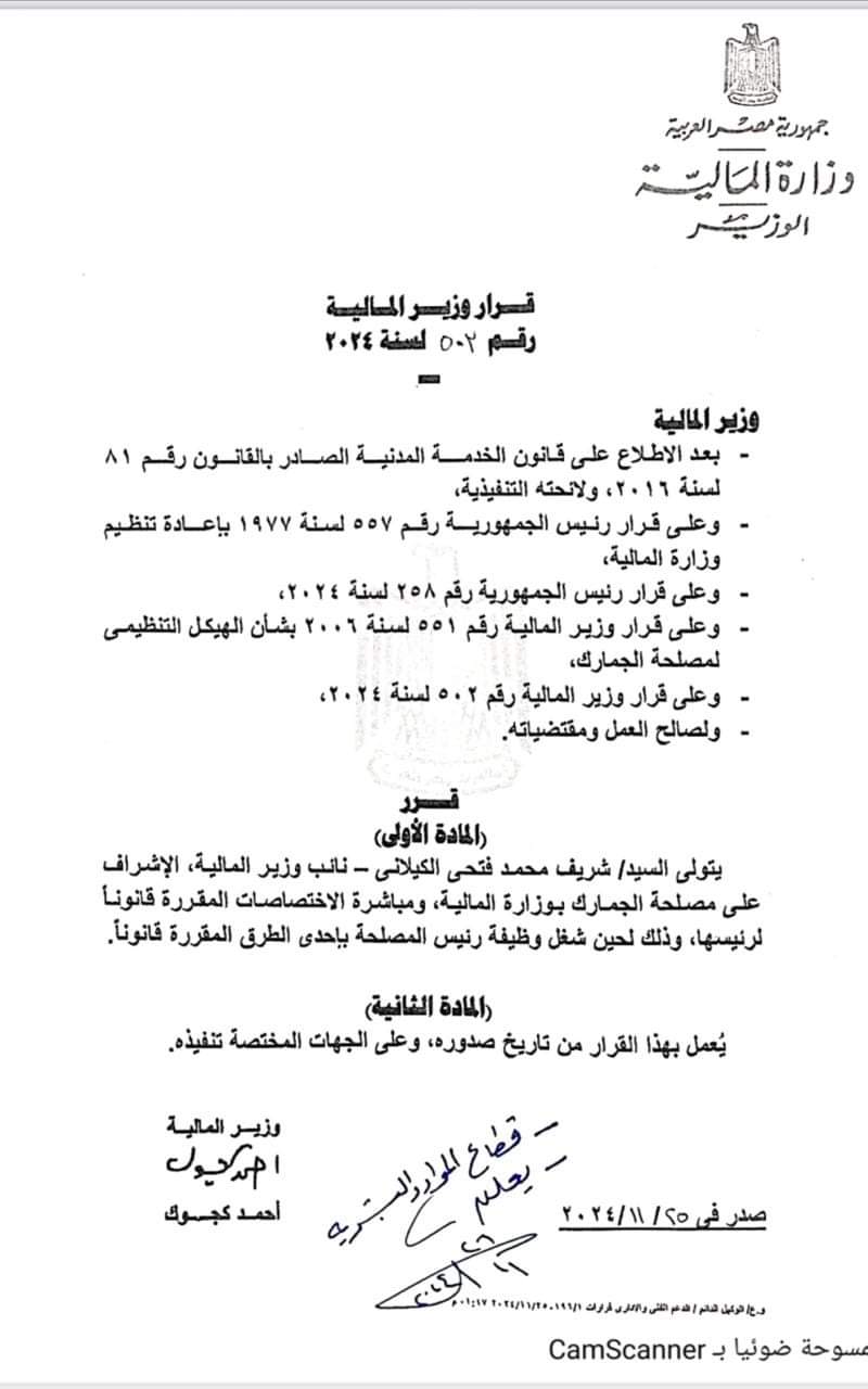 وينص القرار رقم 503 لسنة 2024 على أن يتولى شريف محمد فتحي الكيلاني، نائب وزير المالية الإشراف على مصلحة الجمارك بوزارة المالية، ومباشرة الاختصاصات المقررة قانونًا لرئيسها، وذلك لحين شغل وظيفة رئيس المصلحة بإحدى الطرق المقررة قانونًا.