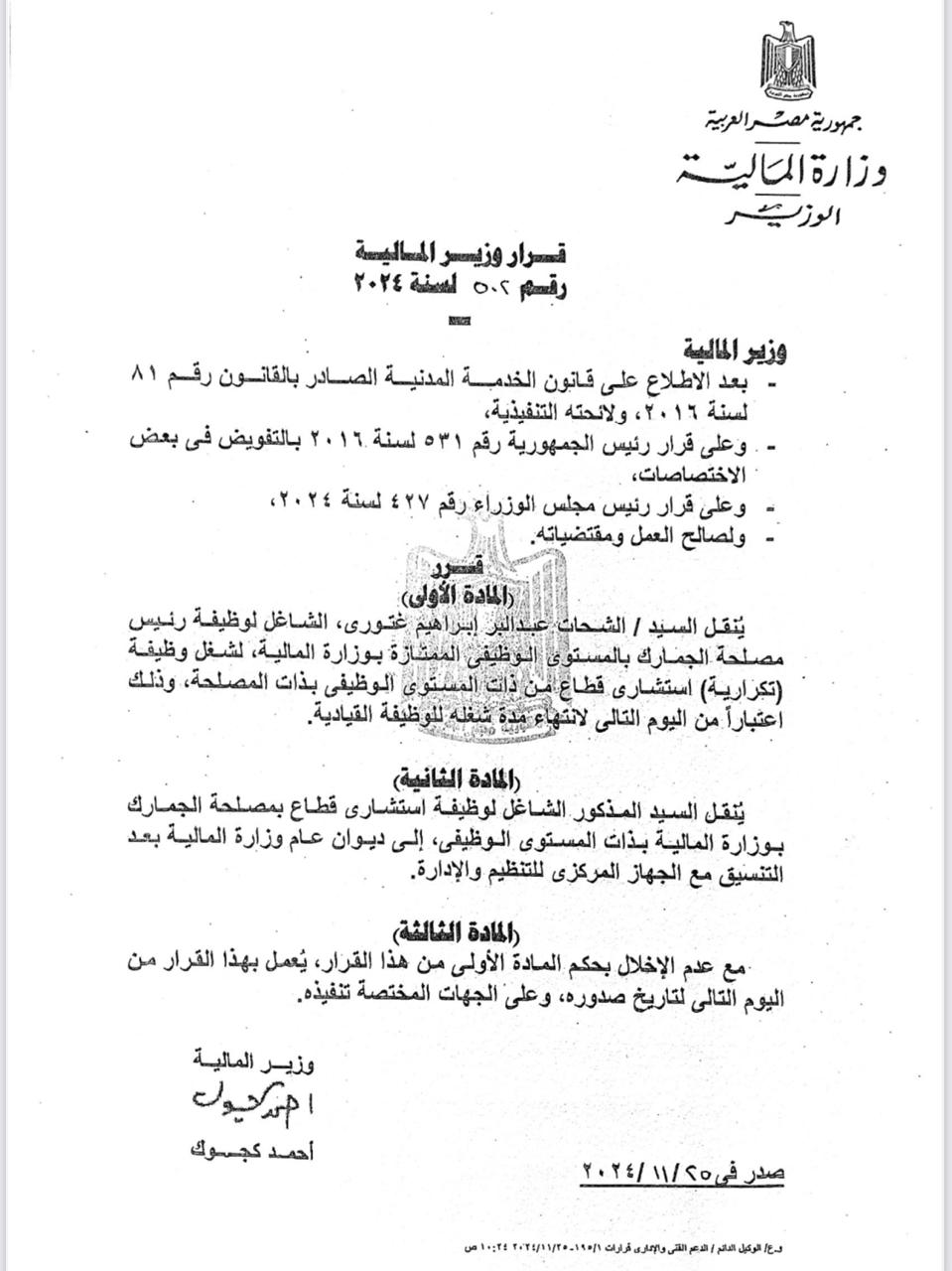 وينص القرار رقم 502 لسنة 2024 على أن ينقل الشحات عبد البر إبراهيم غتوري، الشاغل لوظيفة رئيس مصلحة الجمارك بالمستوى الوظيفي الممتازة بوزارة المالية، لشغل وظيفة تكرارية، استشاري قطاع من ذات المستوى الوظيفي بذات المصلحة، وذلك اعتبارًا من اليوم التالي لانتهاء مدة شغله للوظيفة القيادية.