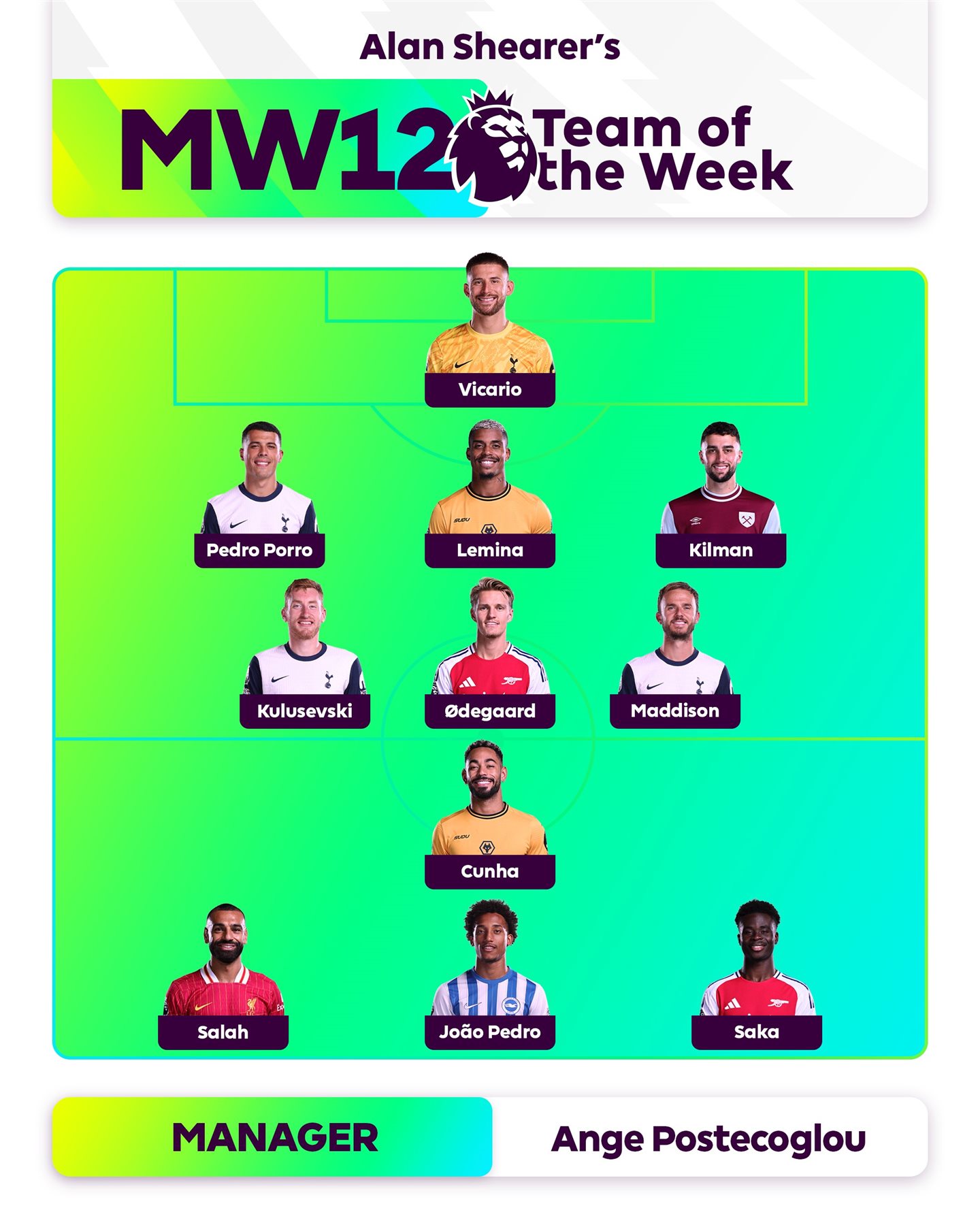 وأعلنت الحسابات الرسمية للدوري الإنجليزي الممتاز على مواقع التواصل الاجتماعي، التشكيل المثالي للجولة الـ12 من البطولة، وَفقًا لاختيارات آلان شيرر أسطورة منتخب إنجلترا.