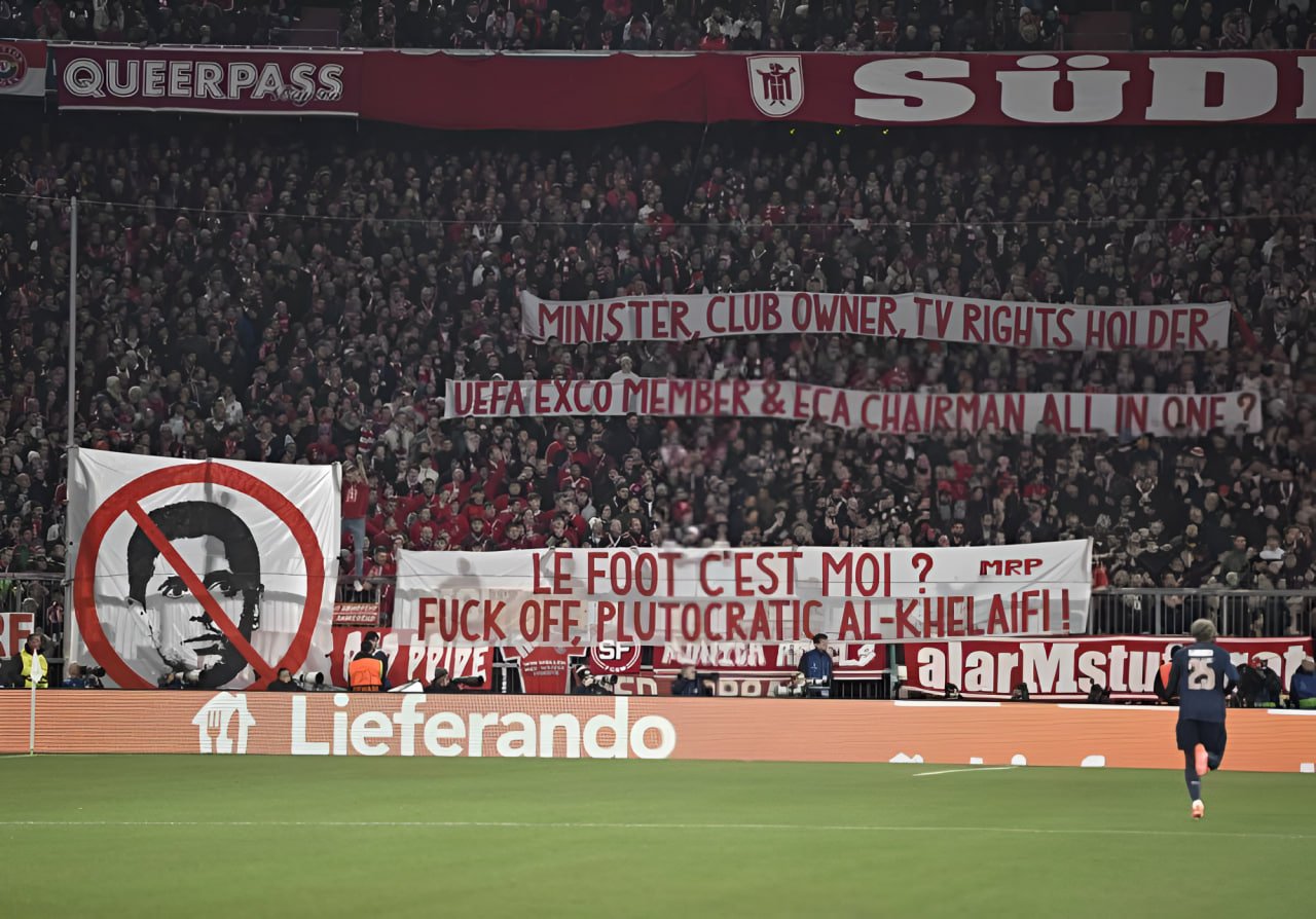 ورفعت جماهير بايرن ميونخ لافتة في مباراة باريس سان جيرمان المقامة الآن بدوري الأبطال، حيث كتبوا فيها: وزير، مالك نادي، صاحب حقوق بث تليفزيوني، عضو في اللجنة التنفيذية لـ يويفا، ورئيس رابطة الأندية الأوروبية، كل هذا في شخص واحد.. كرة القدم، هل هي أنا.. اغرب عن وجهنا يا الخليفي البلوتوقراطي.