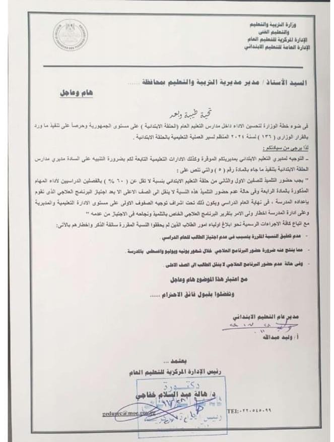 وأكدت وزارة التربية والتعليم، بالتوجيه لمديري التعليم الابتدائي بمديريتكم وكذلك الإدارات التعليمية التابعة لكم بضرورة التنبيه على مديري مدارس الحلقة الابتدائية بتنفيذ ما جاء بالمادة رقم 5 والتي تنص على: