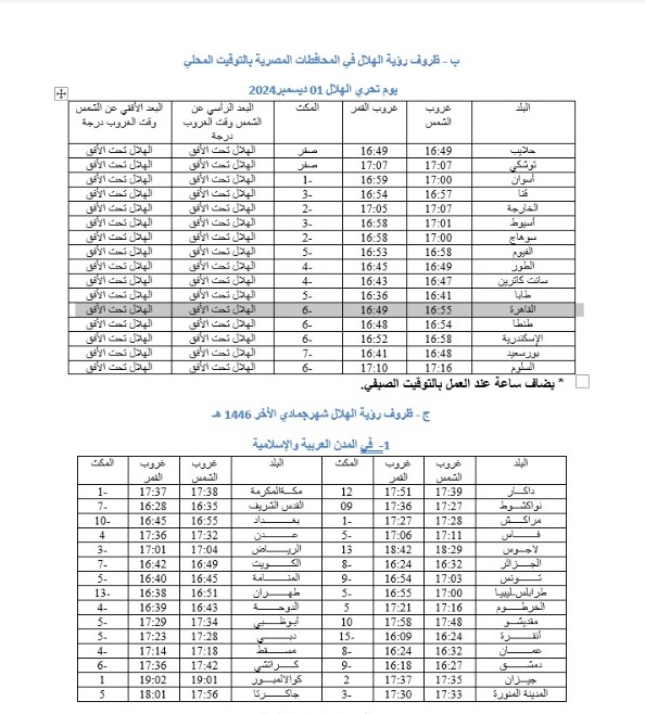 وفيما يلي بيان مفصل عن ظروف رؤية الهلال وأوجه القمر في مدينة القاهرة ومحافظات جمهورية مصر العربية، وبعض العواصم العربية والإسلامية والغربية: