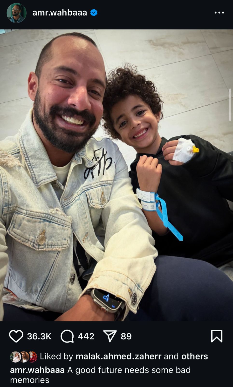 وفي سياق آخر، نشر عمر وهبة صوره له رفقة نجله عبر حسابه الرسمي بموقع تبادل الصور والفيديوهات إنستجرام وعلق عليها قائلًا: المستقبل الجيد يحتاج إلى بعض الذكريات السيئة.