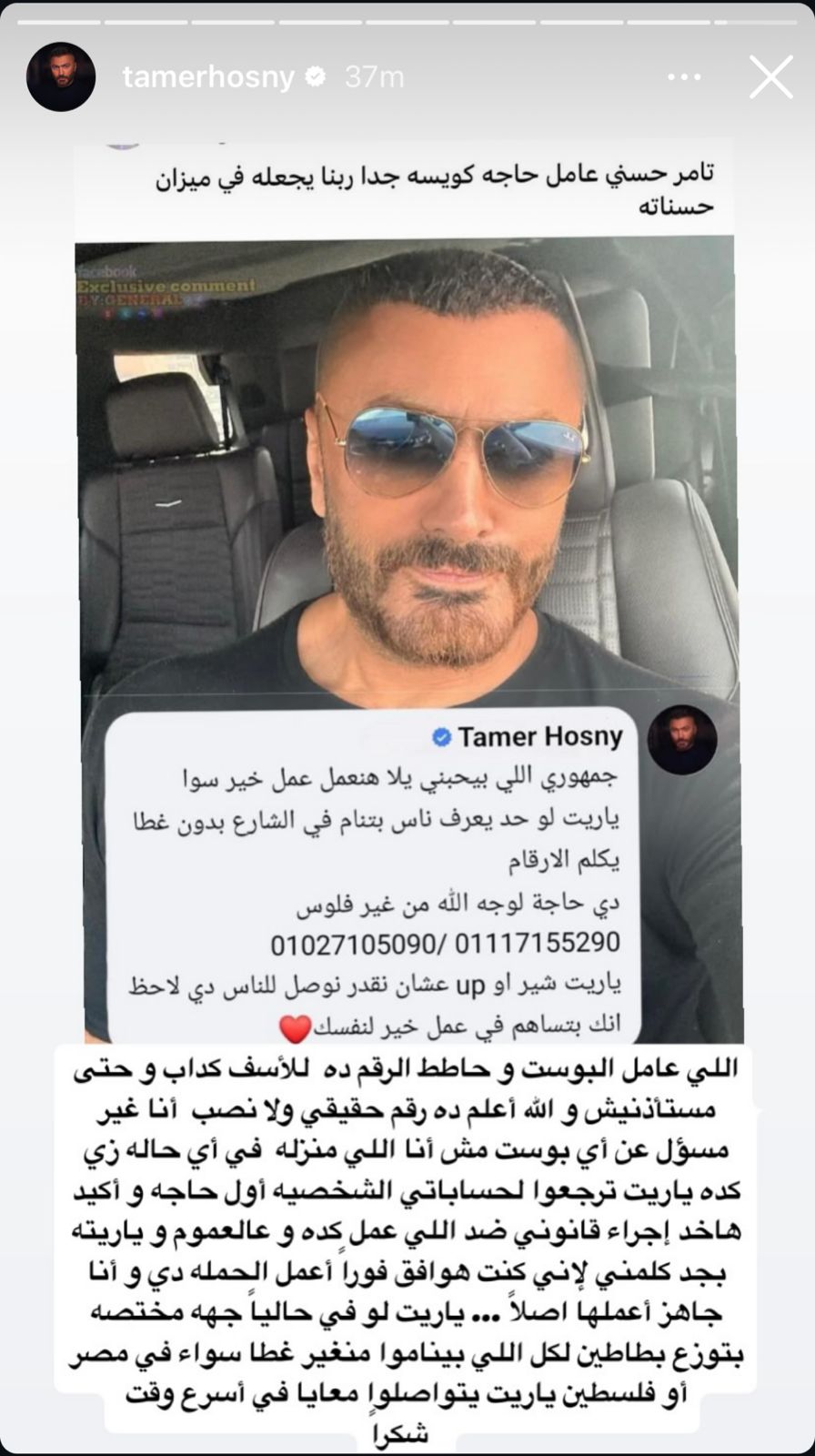 وفي سياق آخر، نشرت صفحه تدعى أنها الصفحه الرسمية لـ الفنان تامر حسني ونشرت منشورا قالت فيه: جمهوري اللي بيحبني يلا هنعمل خير سوا ياريت لوحد يعرف ناس بتنام في الشارع بدون غطا يكلمنا على الأرقام دي.