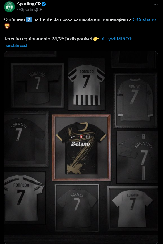 أعلن فريق سبورتنج لشبونة البرتغالي عن القميص الثالث باللون الأسود، وظهر فيه نجل كريستيانو رونالدو وهو يرتدي القميص الذي صُنع خصيصًا تكريمًا لأسطورة النادي البرتغالي.