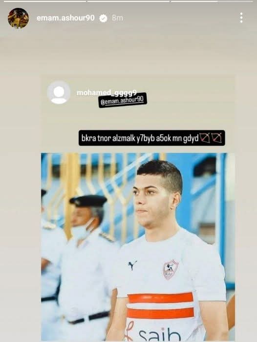 وأعاد إمام عاشور نشر ستوري عبر حسابه الرسمي على إنستجرام لـ مشجع زملكاوي وهو يقول له: “بكرة تنور الزمالك يـ حبيب أخوك”.