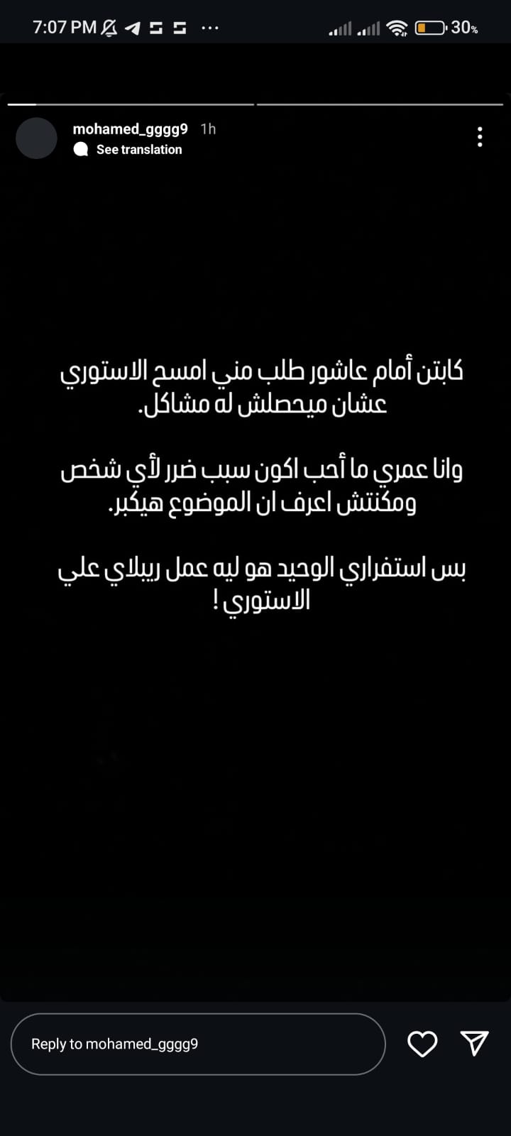 وسرعان ما حذفها إمام عاشور لاعب الأهلي، ليعيد صاحب الحساب المشجع الزمالكاوي نشر ستوري أخرى يقول فيها: كابتن إمام عاشور طلب مني أمسح الاستوري عشان ميحصلش له مشاكل، وأنا عمري ما أحب أكون سبب ضرر لأي شخص ومكنتش أعرف إن الموضوع هيكبر، بس هو ليه عمل ريبلاي على الاستوري!.