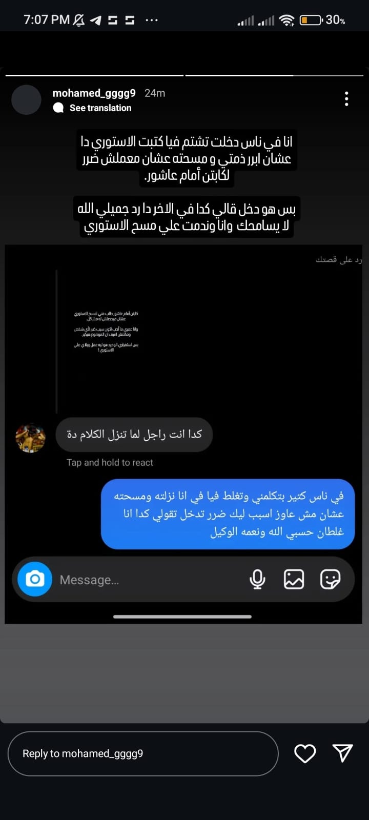 كما نشر المشجع الزملكاوي ستوري أخرى لـ رد إمام عاشور عليه، حيث قال له: كده أنت راجل لما تنزل الكلام دا، ليرد عليه الشخص قائلًا: في ناس كتير بتكلمني احذف الاستوري تقوم تغلط فيا عشان مش عاوز أسبب ليك ضرر تدخل تقولي كده؟ أنا غلطان حسبي الله ونعم الوكيل.