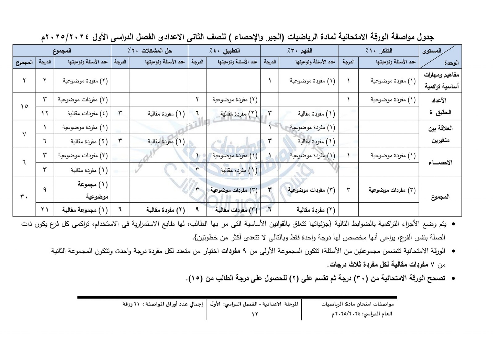 - بالنسبة للصف الثاني الإعدادي: يعقد امتحان تحريري يشمل كل امتحان ورقتين مستقلتين إحداهما لمادة الجبر والإحصاء والأخرى، لمادة الهندسة والقياس ويخصص له 15 درجة لكل ورقة امتحانية، وتصبح الدرجة التحريرية للتلميذ في نهاية كل فصل دراسي 30 درجة مجموع درجتي ورقة الجبر والإحصاء، وورقة الهندسة والقياس.