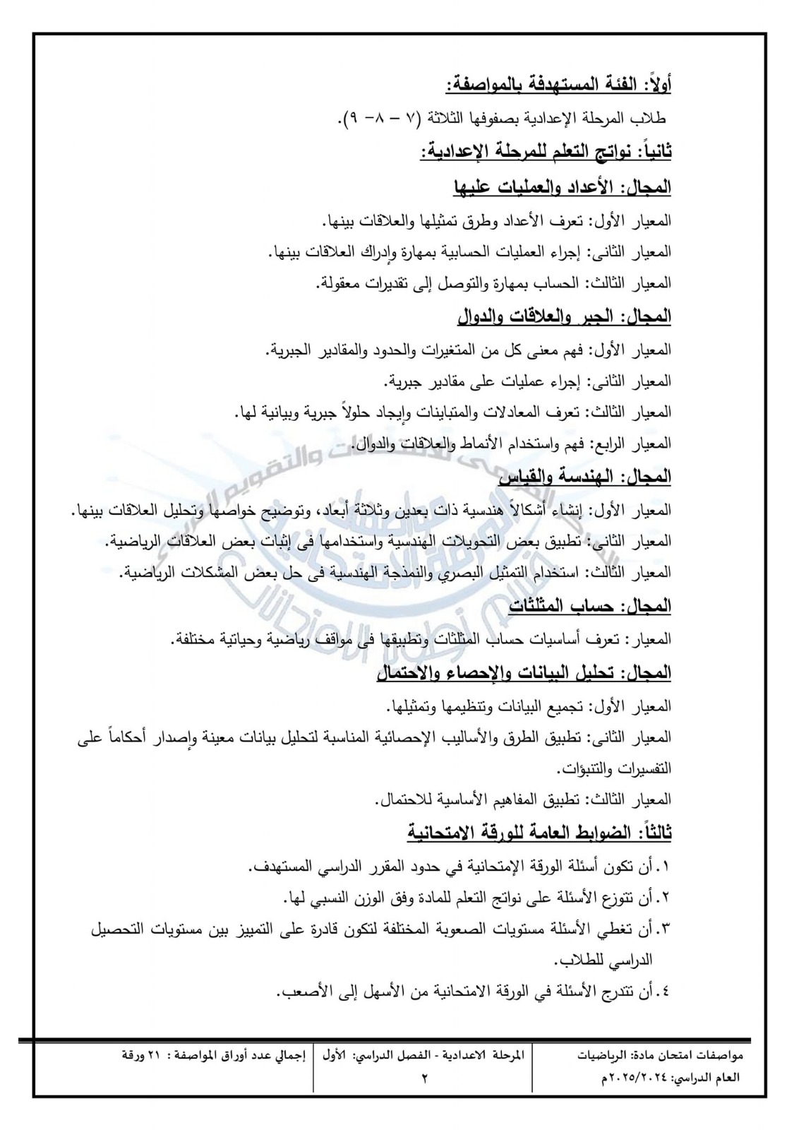 مواصفات امتحان الرياضيات للمرحلة الإعدادية