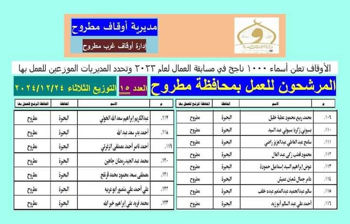 أعلن الشيخ حسن بصيرة وكيل وزارة الأوقاف بمطروح إلغاء قرار تعيين عدد من عمال من محافظة البحيرة بمديرية الأوقاف بمطروح وإعادة عمل مسابقه لتقديم أبناء مطروح في الوظائف.