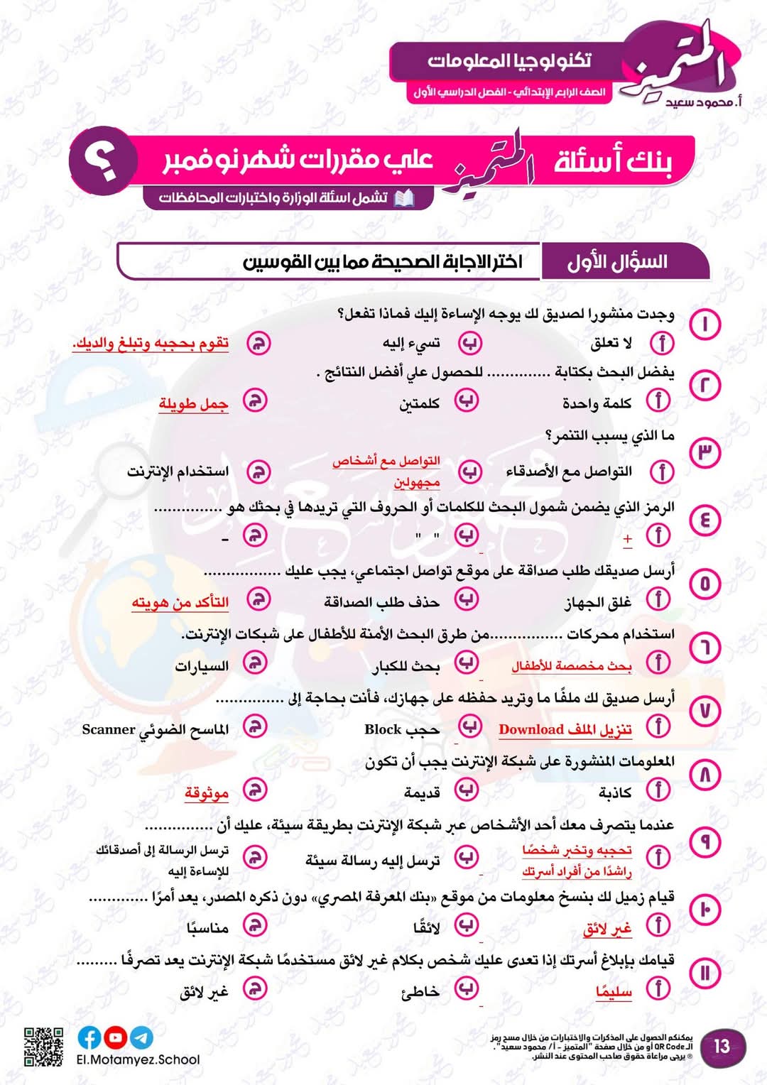 سؤال وجواب.. مراجعة مادة تكنولوجيا المعلومات للصف الرابع الابتدائي على مقرر امتحانات شهر نوفمبر 2024