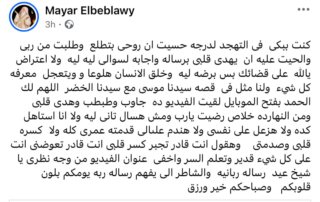 وكتبت ميار الببلاوي منشورًا، عبر حسابه الشخصي بموقع التواصل الاجتماعي فيس بوك، قال فيه: كنت ببكي في التهجد لدرجة حسيت إن روحي بتطلع وطلبت من ربي وألحيت عليه إن يهدي قلبي بـ رسالة وإجابة لسؤالي ليه؟، ولا اعتراض يا الله على قضائك بس برضه ليه، وخلق الإنسان هلوعًا ويتعجل معرفة كل شيء، ولنا مثل في قصة سيدنا موسى مع سيدنا الخضر، اللهم لك الحمد بفتح الموبايل لقيت الفيديو ده جاوب وطبطب وهدى قلبي.