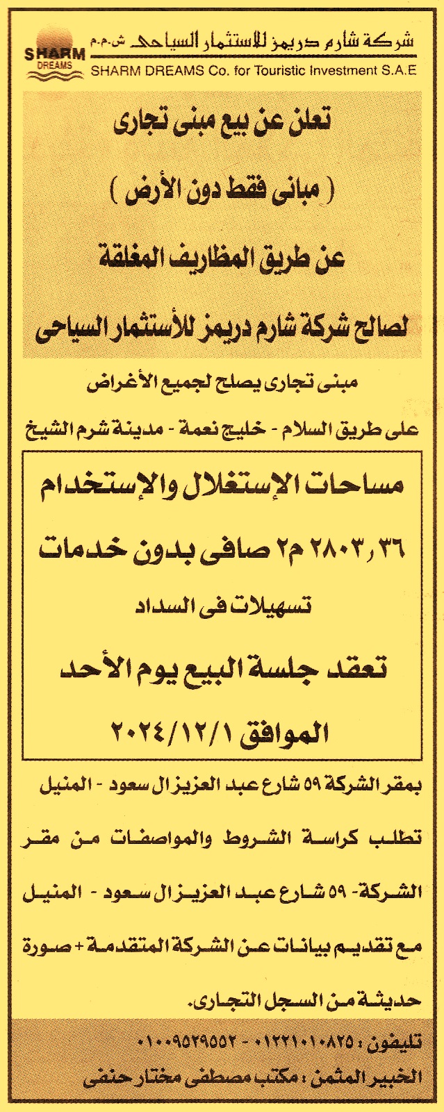 ويعتبر المبنى التجاري تابعا لـ شارم دريمز للاستثمار السياحي، وتكون عملية البيع للمبنى فقط دون الأرض، ووفق الإعلان المنشور من قبل الشركة فإن المبنى تجاري ويصلح لجميع الأغراض، ويقع على طريق السلام خليج نعمة بمدينة شرم الشيخ وتبلغ مساحته 2803.36 م2 صافي بدون خدمات وتسهيلات في السداد