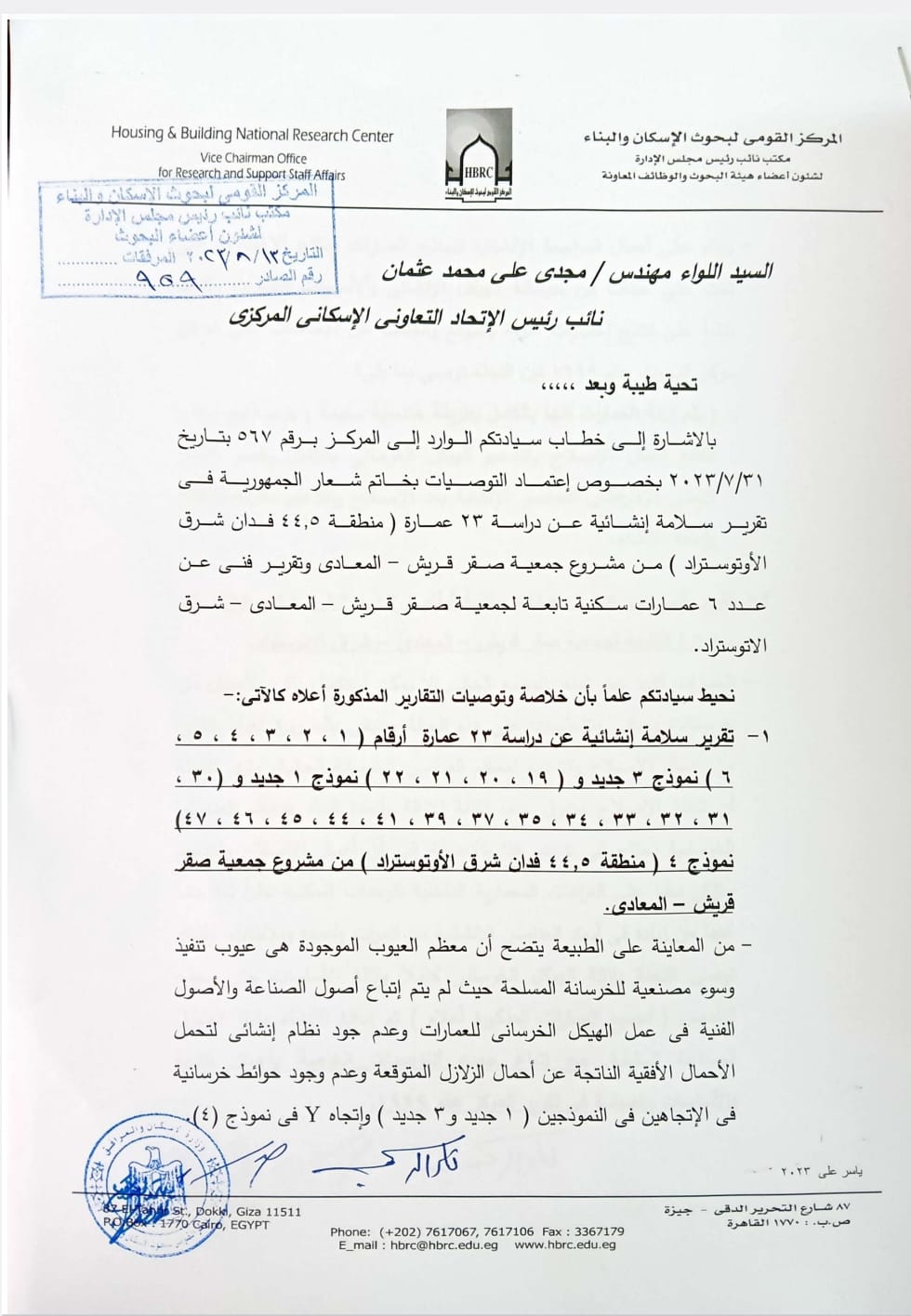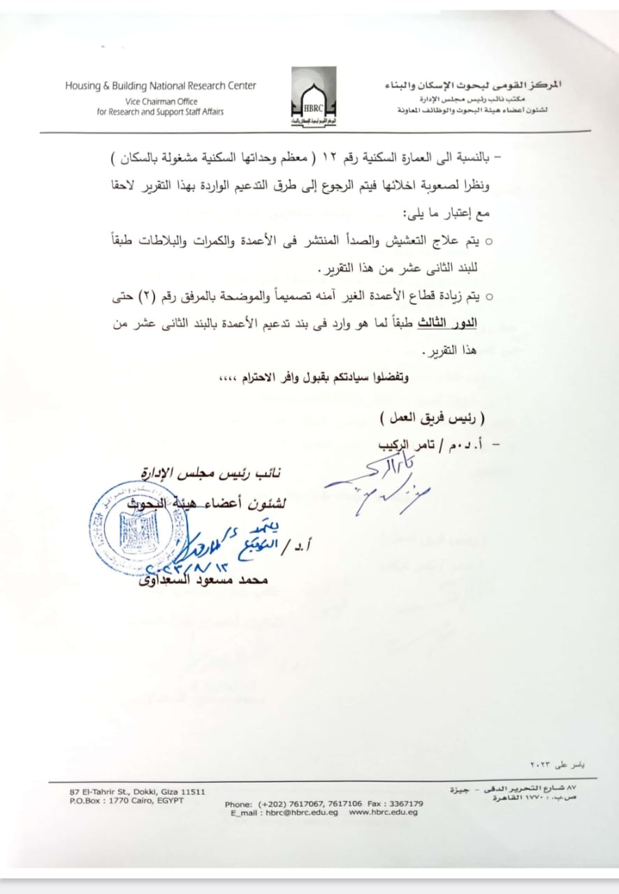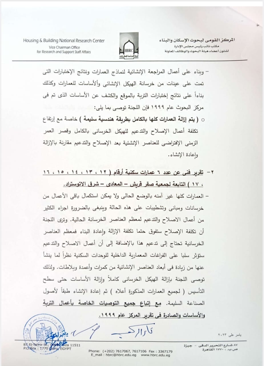 وأكدت محافظة القاهرة، أن تقارير المركز القومي لبحوث الإسكان، والجهاز القومي للتفتيش الفني أشارت إلى أن العمارات كلها غير آمنة وفقًا لوضعها الحالي ولا يمكن استكمال باقي الأعمال من خرسانات ومبانى وتشطيبات على هذه الحالة، وينبغي بالضرورة اجراء الكثير من أعمال الإصلاح والتدعيم لمعظم العناصر الخرسانة الحالية.