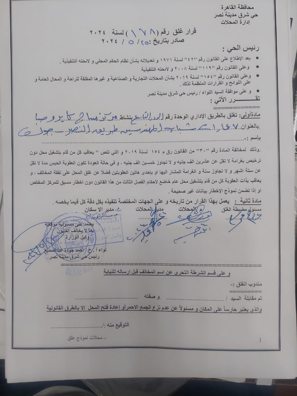 وحصل القاهرة 24 على نسخة من قرار الغلق رقم 178 لسنة 2024، الصادر بتاريخ 25/5/2024 لغلق تشميع المنشأة، لوجود مخالفات بالعنوان المذكور.