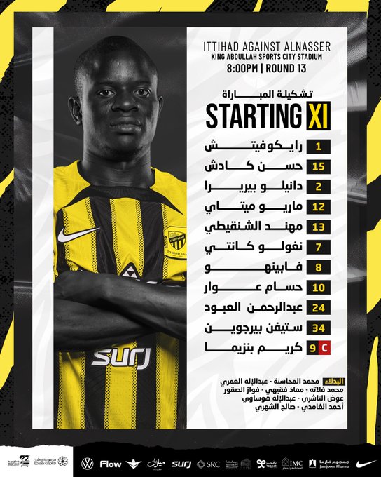 - خط الوسط: نجولو كانتي- فابينيو- عبد الرحمن العبود- حسام عوار.