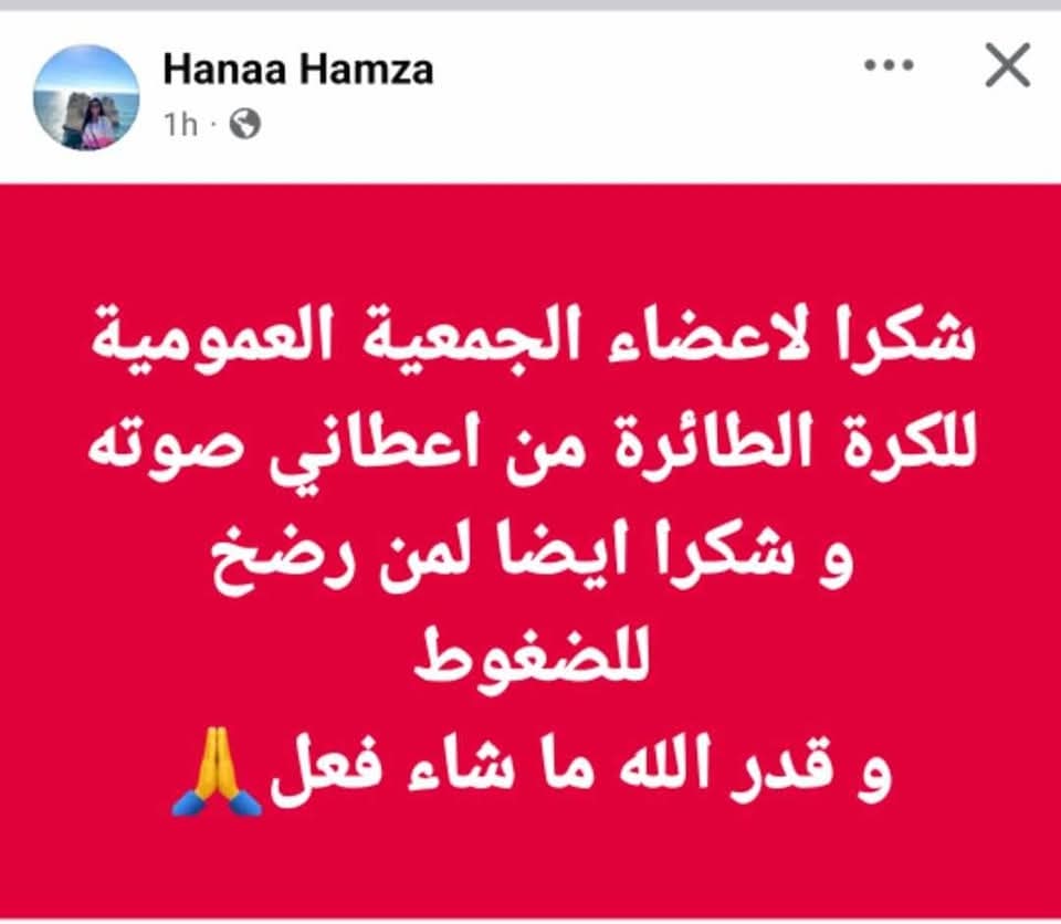 وقالت هناء حمزة عبر حسابها الشخصي على موقع التواصل الاجتماعي فيس بوك: شكرًا لأعضاء الجمعية العمومية للكرة الطائرة من أعطاني صوته.. وشكرًا أيضا لمن رضخ للضغوط وقدر الله ما شاء فعل.