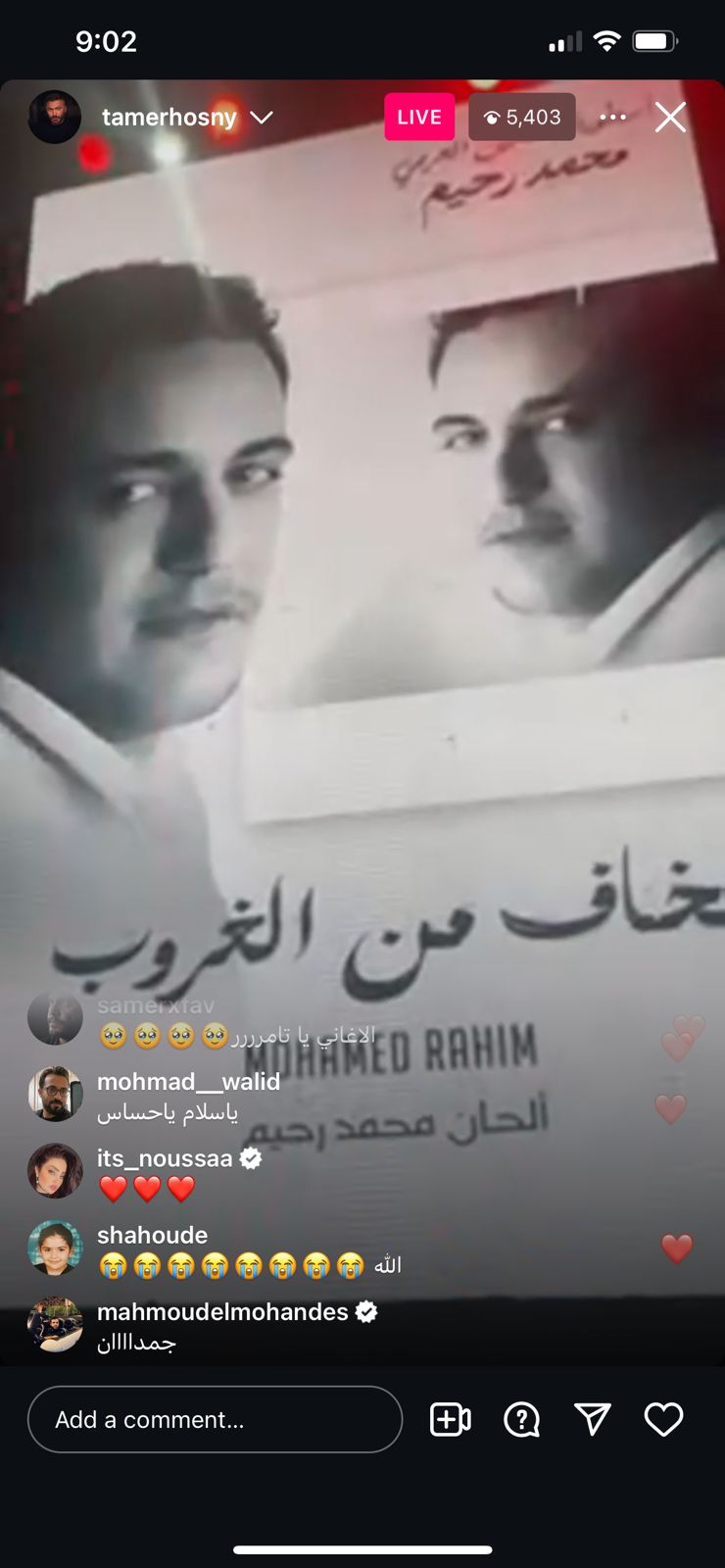 وظهر تامر حسني خلال لايف عبر حسابه الرسمي بـ موقع تبادل الصور والفيديوهات إنستجرام، وهو ممسك بالأورج الخاص به ويغني أعمال الراحل محمد رحيم التي تعاون فيها مع جميع الفنانين.