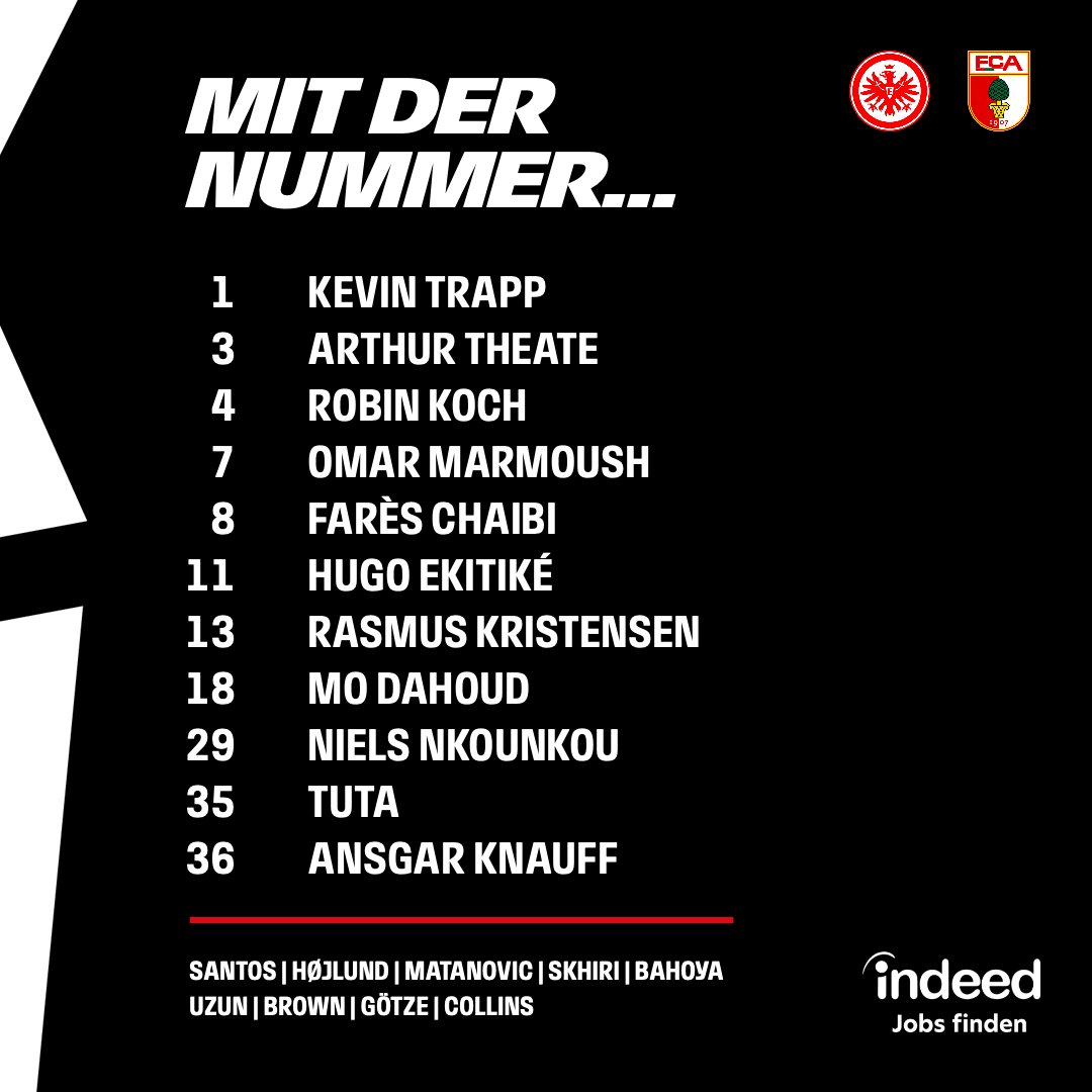 أعلن دينو توبمرلر المدير الفني لفريق آينتراخت فرانكفورت تشكيل لاعبيه لمواجهة أوجسبورج، في المباراة المقرر انطلاقها في الرابعة والنصف عصرًا، ضمن منافسات الجولة الـ 13 بالدوري الألماني، وذلك على ملعب حديقة دويتشه بنك معقل فريق فرانكفورت.